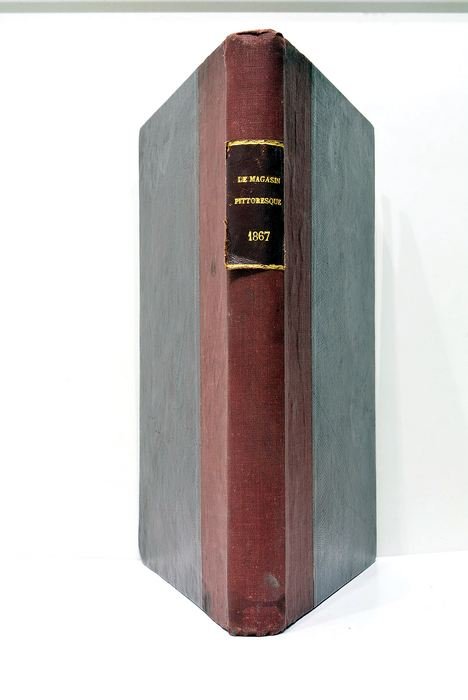 35e année seule. 412 pages. 4 feuillets. Illustrations hors et dans le texte. (30x20,5cm). Demi-toile. Couverture et dos frottés et salis. Petites déchirures marginales. Coins émoussés. Publié à Paris en 1867, cet ouvrage collectif dirigé par Édouard Charton s'inscrit dans une période riche en découvertes et en développements culturels. À travers les pages du trente-cinquième volume du Magasin pittoresque, le lecteur est invité à explorer un panorama varié de sujets, allant des avancées scientifiques aux curiosités historiques, reflétant les intérêts et l'appétit pour le savoir de l'époque. Cette publication annuelle, bien ancrée dans le paysage éditorial français du XIXe siècle, témoigne de l'effervescence intellectuelle de l'époque, tout en offrant un miroir des préoccupations et des fascinations de la société contemporaine. Papier bruni avec petites taches et rousseurs éparses. Déchirures marignales. Cahier légèrement déboîté. Illustrations hors et dans le texte. 35e année seule.
