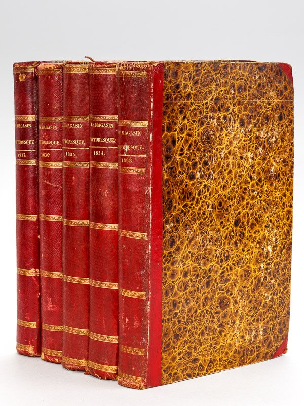 5 vol. in-4 reliure d'époque demi-basane à petits coins chagrinée rouge, Etablissement Encyclographique, Bruxelles, 1833-1837, près de 420 pp. par tome , des serpentes sont insérées systématiquement entre chacun des feuillets ! Rare réunion des 5 premiers tomes de l'édition belge du Magasin Pittoresque (rel. frottées avec petits accrocs, qq. mouill.) Prix de l'ensemble.