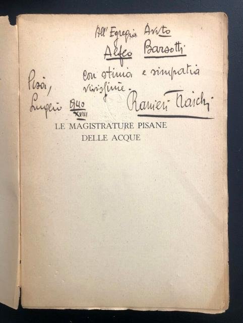 Nistri – Lischi Editori – Pisa, 1938 – XVII. Esemplare numero 427. In 4to, front.in rosso / nero, pp.XIV (Indice) + 1 (Avvertenza), 551 (con Indice dei nomi di persona, di luogo e di corso d'acqua), alcune ill. fot. in b/n f. t. su carta patinata e con didascalie, bross. edit. in carta. Dedica autografa alla prima bianca da parte dell'Autore "All'Egregio Avv.to Alfeo Barsotti con stima e simpatia vivissime. Pisa, Luglio 1940 – XVIII. Ranieri Fiaschi". In una nota dattiloscritta di ringraziamento del ricevente all'Autore, trovata all'interno del volume, si legge: "[.] fa meraviglia che in Pisa - dove non sono mancati gli uomini versati alla storia - nessuno abbia pensato prima di voi ad un tema così suggestivo e di tanta importanza [.] perché l'ordinamento delle antiche Magistrature delle Acque è talmente legato all'evoluzione di Pisa, che a leggere il vostro libro si percorre la storia politica, militare, civile, sociale, edilizia, intellettuale, agricola, forestale, di questa nobilissim45a città e dell'agro circostante [.]. Mancanze agli estremi del dorso e distacco del piatto anteriore, peraltro volume in buono stato di conservazione.
