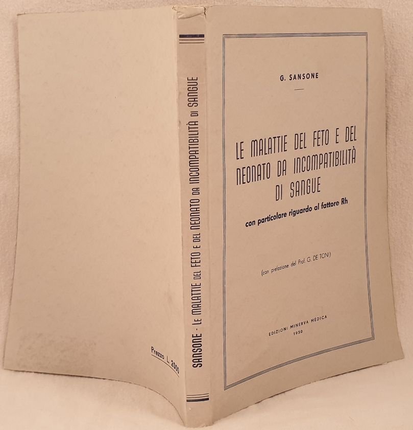 Edizione del 1950 dio questa monografia sulle malattie del feto e del neonato da incompatibilità di sangue scritto da Sansone. Prefazione del Prof. G. de Toni. Numerose foto in bianco e nero all'interno e illustrazioni a colori. All'interno: Eritroblastosi fetale, Studio patogenetico della malattia emolitica del neonato, studio clinico della malattia emolitica del neonato, terapia, contributo casistico, Ripercussioni scientifiche e aspetti sociali degli studi sul fattore Rh ecc. In ottime condizioni.Copertina editoriale in ottime condizioni generali con lievi usure ai margini e dorso. Legatura in ottime condizioni. Pagine in ottime condizioni con rare fioriture. In 8. Dim. 24,5x17,5 cm. Pp. 269+(1) Edition of 1950 of this monography about deseases of newborn with incompatibility of blood written by Sansone.<BR> Prefation by Prof. G. de Toni. Different black and white photoes and coloured illustrations. Editorial cover in very good general conditions slightly worn in the edges and spine. Binding in very good conditions. Inside pages are in very good conditions with occasional foxings. In 8. Dim. 24,5x17,5 cm. Pp. 269+(1)