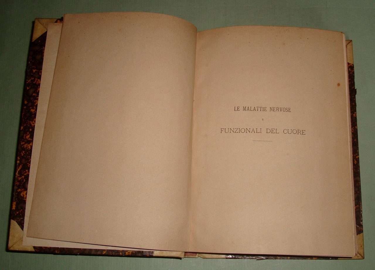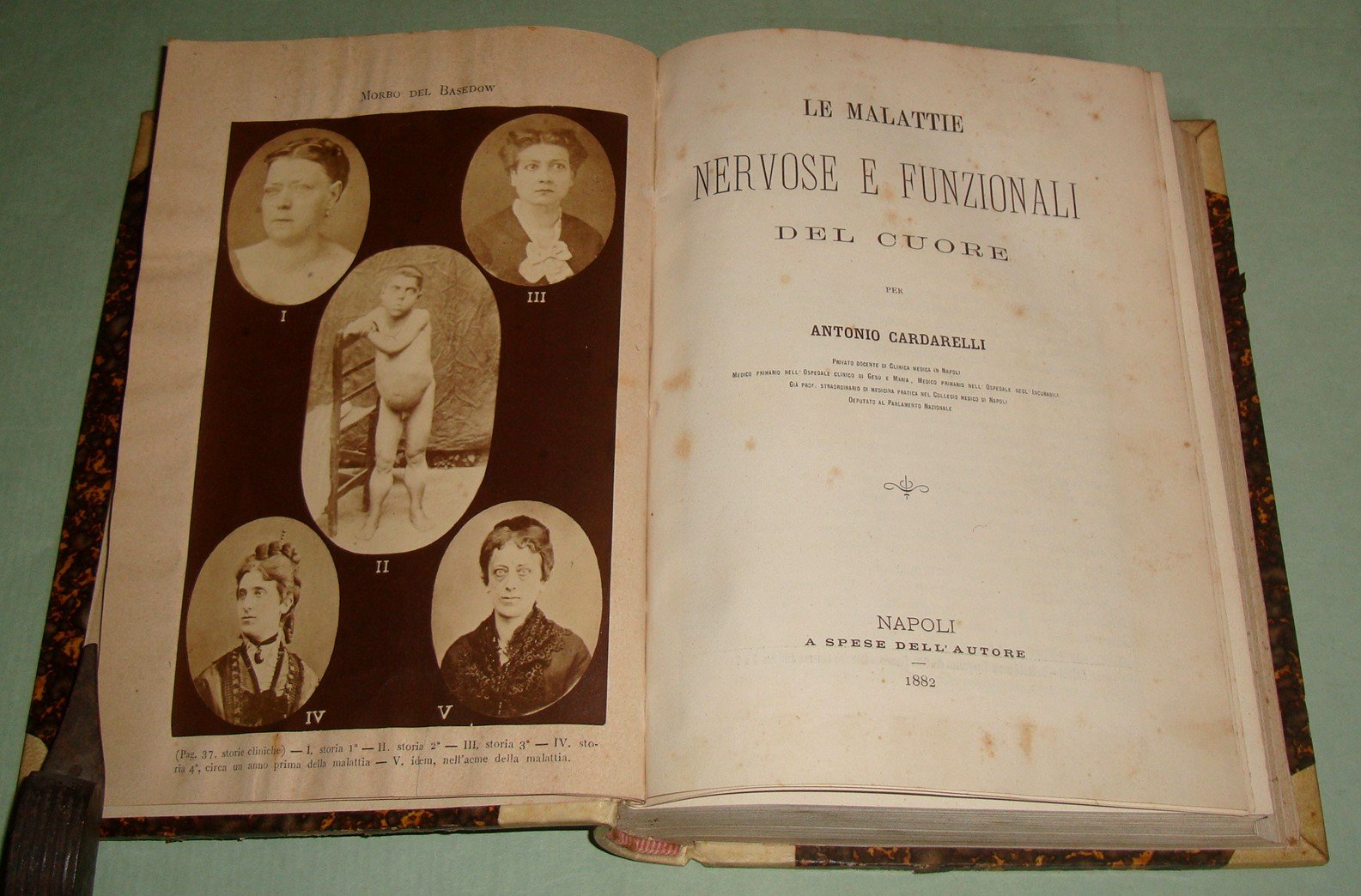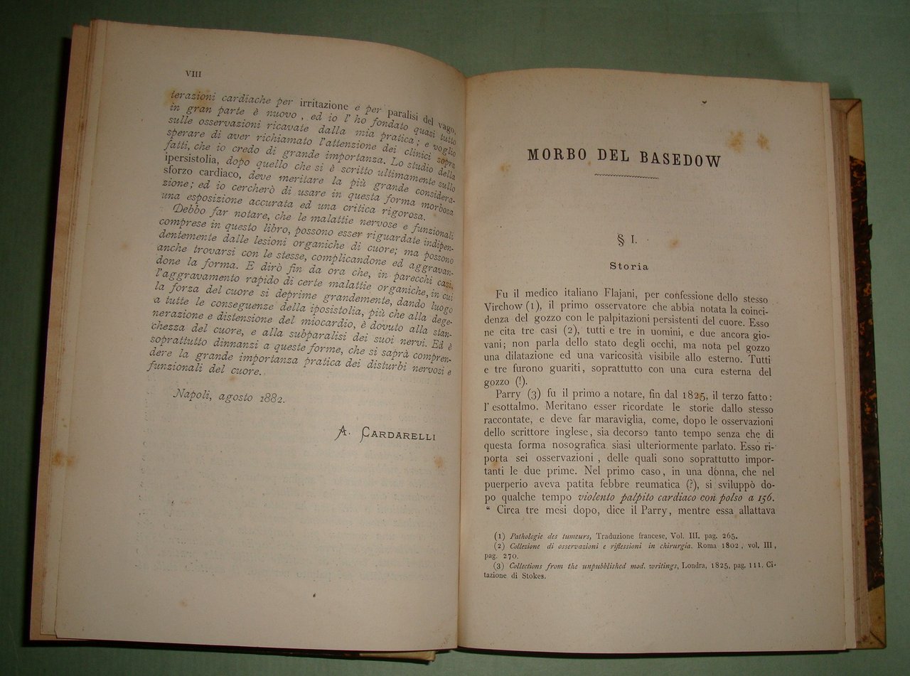 Napoli, a spese dell’Autore, 1882. In 8vo; pp.VIII,527. Una tavola in antiporta: Morbo del Basedow. Cinquanta illustrazioni nel testo. Mezza pergamena con angoli, titolo e fregi in nero al dorso. Prima edizione rara. Treccani.it: “Il C. studiò con contributi originali il tremore basedowiano che interpretò come dipendente da lesioni nervose, cioè, come diremmo oggi, da patogenesi diencefalica. È, da notare che il C. pubblicò questi studi nel 1882, nel trattato su Le malattie nervose e funzionali del cuore (Napoli), un anno prima che P. Marie illustrasse i sintomi cardinali della malattia di Flajani-Basedow (Sur la nature et sur quelques-uns des symptomes de la maladie de Basedow, in Arch. neurol., VI [1883], pp. 79-85).
