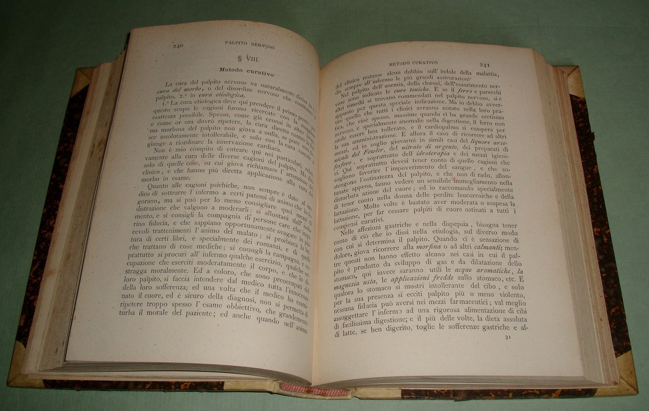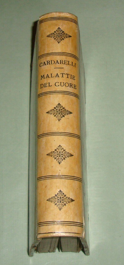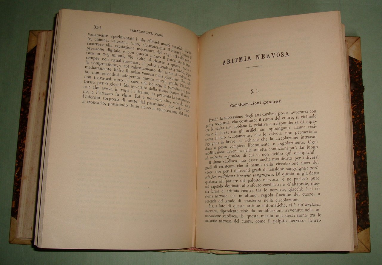 Napoli, a spese dell’Autore, 1882. In 8vo; pp.VIII,527. Una tavola in antiporta: Morbo del Basedow. Cinquanta illustrazioni nel testo. Mezza pergamena con angoli, titolo e fregi in nero al dorso. Prima edizione rara. Treccani.it: “Il C. studiò con contributi originali il tremore basedowiano che interpretò come dipendente da lesioni nervose, cioè, come diremmo oggi, da patogenesi diencefalica. È, da notare che il C. pubblicò questi studi nel 1882, nel trattato su Le malattie nervose e funzionali del cuore (Napoli), un anno prima che P. Marie illustrasse i sintomi cardinali della malattia di Flajani-Basedow (Sur la nature et sur quelques-uns des symptomes de la maladie de Basedow, in Arch. neurol., VI [1883], pp. 79-85).