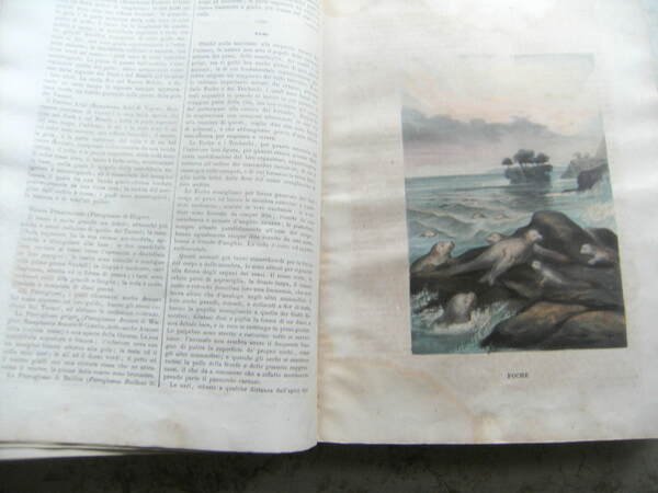 Collezione completa rilegata relativa all'anno 1866. In 4°, pp 416 con numerosissime illustrazioni in nero n.t., 14 tavole in nero e 6 tavole colorate f.t. Leg. in m. pelle con piatti marmorizzati, titolo, filetti e fregi in oro al dorso. Abrasioni ai piatti e dorso riparato. All'interno una tavola in nero presenta uno strappo, riparato grossolanamente. Il testo si presenta in buono stato (alcune inevitabili gore per il tipo di carta) con legatura salda. Splendide e delicatissime le sei tavole a colori che raffigurano foche, orsi bianchi, caccia dei trichechi, ditteri, uccello del paradiso, "colobo guereza" d'Abissinia. Raro.
