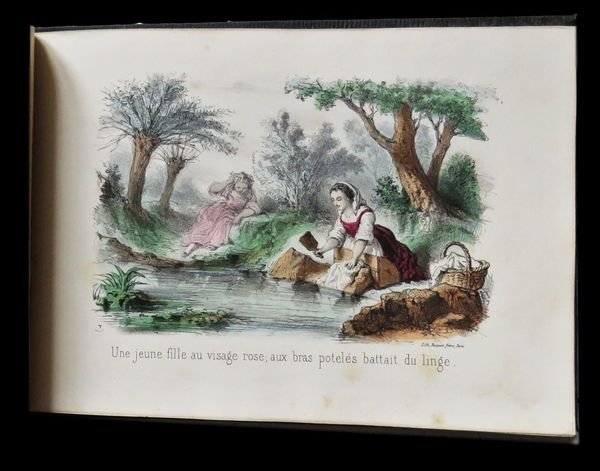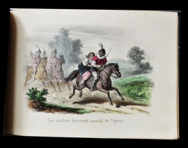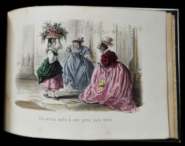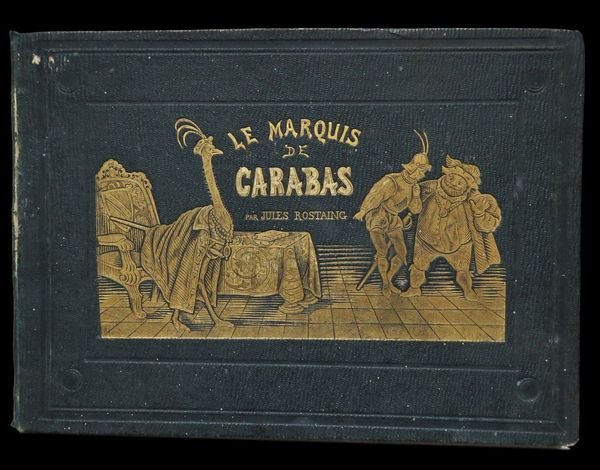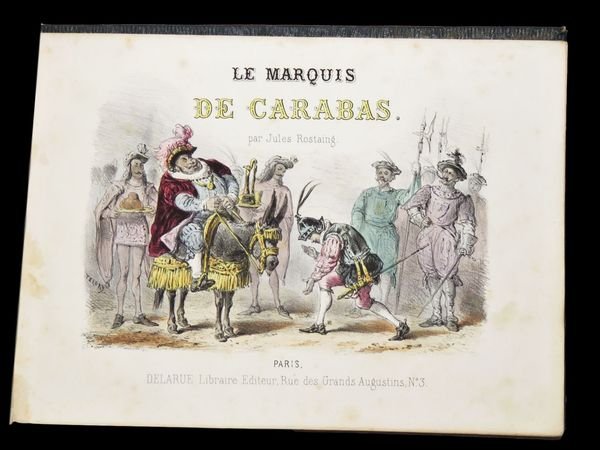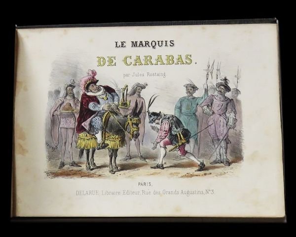 In oblungo (23x16,5 cm); 31, (1) pp. e 16 c. di tav. (compreso il frontespizio inciso ed illustrato) con finissima coloritura coeva. Legatura editoriale coeva in piena tela verde con titolo e ricca scena animata impressa in oro al piatto anteriore, entro doppia cornice a secco (che si ripete anche al piatto posteriore). Prima edizione, non comune, e assai rara a reperirsi in queste più che buone condizioni di conservazione, di questa racconto illustrato da magnifiche tavole incise da Becquet e firmate T. del noto scrittore di racconti per bambini, fiabe e testi educativi di tipo naturalistico, Jules Rostaing. Lautore rielabora la storia del Marchese di Carabas, personaggio immaginario facente parte della fiaba Il gatto con gli stivali. Nella versione più classica, quella di Perrault, il protagonista è un ragazzo di umili origini al quale il gatto con gli stivali cambia il nome, inventando un titolo nobiliare, appunto di Marchese di Carabas. Moltissime sono le versioni della favola fra le quali sono da ricordare quella di Giovanni Francesco Straparola (nel 1566), poi Giambattista Basile nel Seicento, quindi il francese Charles Perrault e Ludwig Tieck, infine i Fratelli Grimm. La storia ci porta sempre al castello dell'Orco-mago: il Gatto giura che appartiene al giovane povero. Secondo Perrault, il maniero è del Marchese di Carabas (o di Carabattole) Il Marchese di Carabas è un parente stretto della maschera di Arlecchino della Commedia dell'Arte, nelle vesti di servo scaltro e truffaldino che fa la felicità e la fortuna del suo padrone e, quindi, anche la sua.. Il testo è arricchito da 16 bellissime tavole illustrate a colori. Raro.