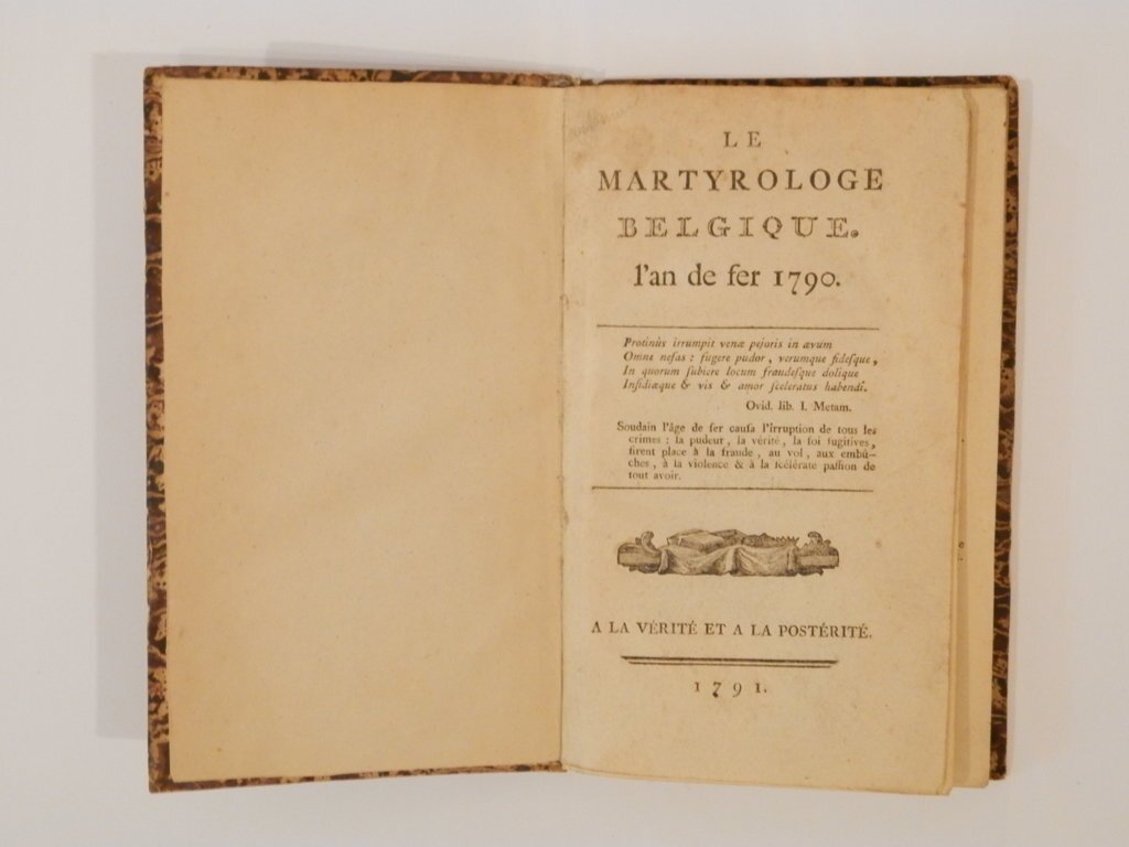 In-8°, mm 210x120, pp. 152. Cartoncino rivestito in carta marmorizzata. Edizione originale di questo opuscolo reazionario del poeta francese esiliato in Belgio. All'interno sono sostiene le ragioni di Giuseppe II in opposizione ai rivoluzionari guidati da Henri van der Noot, primo ministro della breve nazione degli Stati Uniti del Belgio (11 gennaio 1790 – 2 dicembre 1790). Nel testo sono elencate città per città tutte le gesta più cruente del partito rivoluzionario.. *** TUTTI I NOSTRI LIBRI SONO VISIBILI PREVIO CONTATTO MAIL O TELEFONO NELLA NUOVA SEDE DI MILANO: LIBRERIA COSMOPOLIS, VIA JOMMELLI, 22. ***