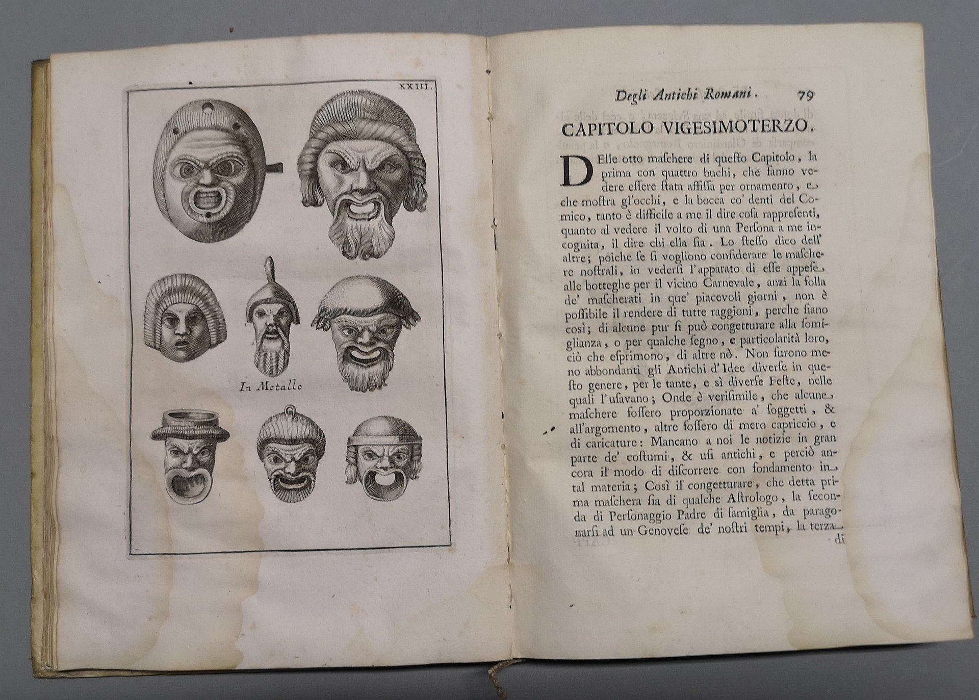 >in-4, pp. (12), 228, leg. coeva p. perg. rigida, tit. oro al dorso, tagli marmorizz. Dedica dell'a. al nobile Paolo Ippolito De Beawillier. Fregi ed iniz. silogr. Con una vignetta sull'occhietto e 85 tavole f.t. inc. in rame (num. 1-84, ma la 44 è bis) raffiguranti ''maschere e figure comiche in cammei, in gemme incise, ed in altri monumenti'' degli antichi Romani, fatte di vario materiale (agata, corniola, onice, terracotta, bronzo, ecc.) e facenti parte della ricca collezione dell'autore. Prima edizione di importante erudita opera, molto stimata e ricercata, tradotta anche in latino e pubblicata nel 1750 (vedi scheda seguente). Esempl. genuino, a grandi margini (con lieve alone d'umido nella parte infer. esterna), ex-libris Sordelli. Cicognara 1652: «Opera che in questa materia può ritenersi per la più classica e copiosa di quante l'hanno preceduta, e seguitata...». Cat. Rasi 368 (ediz. poster.). Olschki, Choix VIII, 10939. Brunet II, 1245. Graesse II, 576.