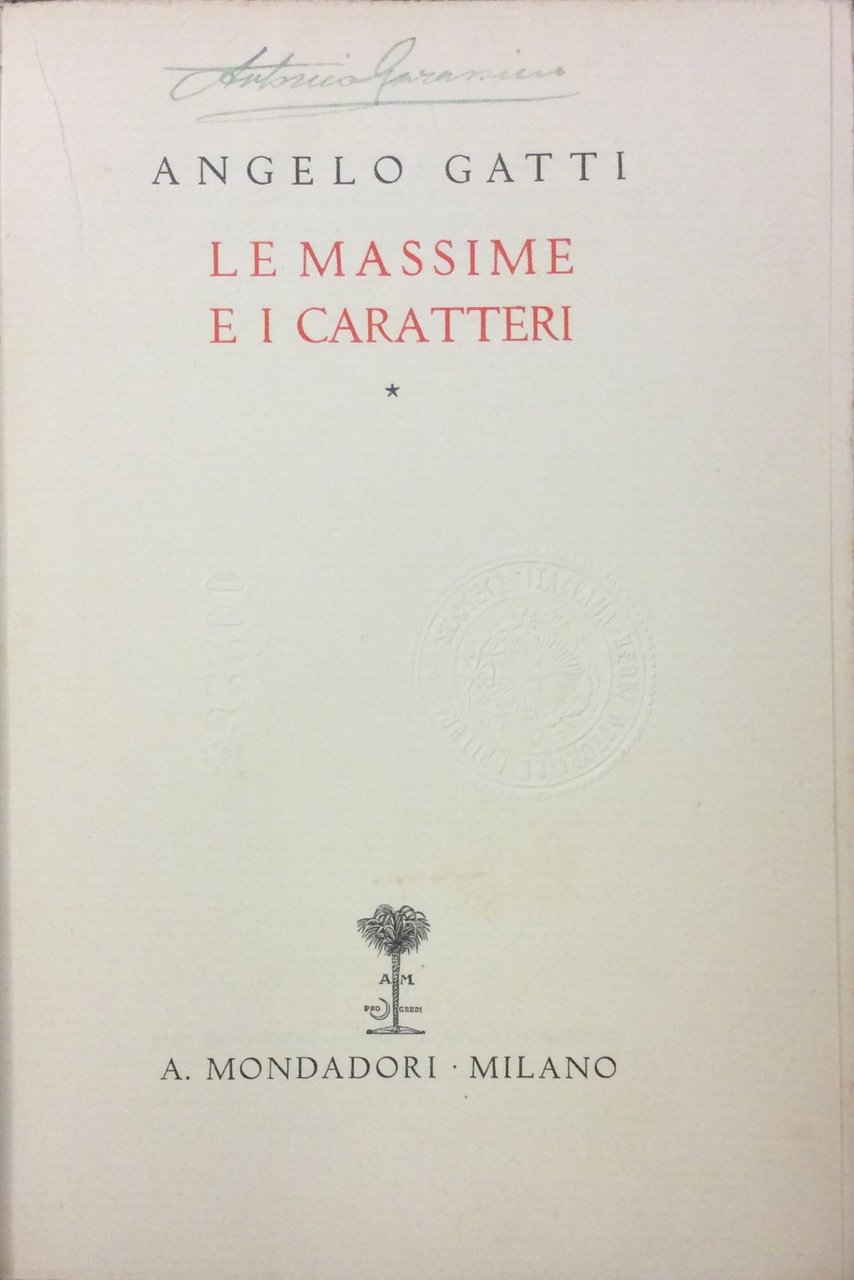 In-16 gr., brossura editoriale, sovracoperta, pp. 313,(3). Prima edizione. Della morale e dei moralisti - Degli uomini - Delle donne - Dei giovani - Degli uomini grandi e dei preminenti - Degli animatori e dei conduttori d'uomini - Dell'amore e degli amanti - Dell'arte e degli artisti. Firma di appartenenza al frontespizio, altrimenti ben conservato, intonso.