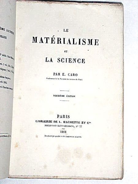 4 pages non chiffrées + VIII + 296 pages (12x19cm). Couverture imprimée protégée par du papier cristal. Exemplaire non rogné. Rousseurs. Ecole Positiviste. Claude Bernard. Chevreul. Matérialisme Expérimental.