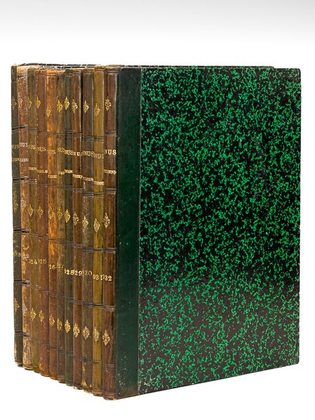11 vol. in-4 reliure uniforme demi-basane verte, dos lisse orné, Le Menu Quotidien [ 11 années suivies, de 1922 à 1932 : plus de 4000 menus et recettes recueillies en 11 volumes, avec table des matières manuscrite ] Année 1922 - 1923 - 1924 - 1925 - 1926 - 1927 - 1928 - 1929 - 1930 - 1931 - 1932, circa 35-40 feuillets par volume Etonnant et impressionnant recueil de plus de 4000 menus et recettes, en autant d'articles contrecollés, découpés dans un quotidien de l'époque non identifié, probablement du Sud-Ouest (voire du Périgord, provenance de l'ensemble) comme le signale des indications manuscrites éparses (par exemple : "Menu offert aux chefs de service des Imprimeries Gounouilhou" ou "Menu Banquet des Directions du Sud-Ouest du 1er mars 1932"). Chaque volume est pourvu d'une table des matières manuscrites, qui recense par ordre alphabétique les innombrables recettes : curaçao supérieur, endives à l'aurore, coquilles Saint-Jacques à la Mornay, pommes à la Chateaubriand, sauce Oxford, petites truites à la genevoise, Yoghourt au lait bulgare, crème franc-comtoise à l'angélique, biscuits milanais, fonds d'artichauts frais à la Montmorency, Fougasse de Menton, Tournedos Fedorah, foie de veau à la Murcie, chartreuse de cervelle, poulet en cocotte à la Mascotte, etc. De multiples coupures de presse d'autre provenance et divers menus ont également été rajoutés. Bon ensemble (rares lacunes, dos lég. frottés). Prix du lot, non séparable.