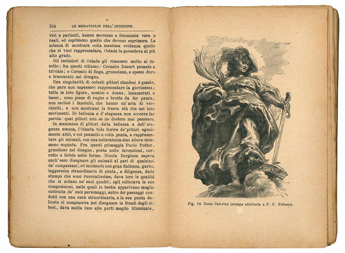 In 16mo (mm 190x124); pp. VII, [1], 300, [4], con 34 illustrazioni xilografiche riproducenti famose opere grafiche di antichi maestri nel testo. Carta uniformemente brunita, lievi fioriture. Brossura editoriale originale. Mancanze al dorso che risulta aperto. Sciolto.