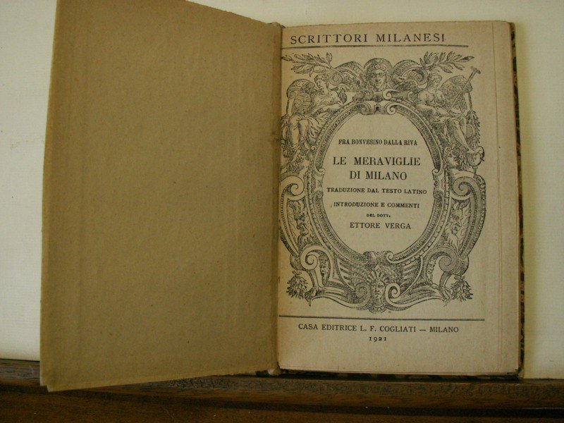 Volume in 8 piccolo, graziosa legatura in carta fiorata dell'epoca, titolo ai dasselli al piatto ed al dorso, sguardie, frontespizio, LXII, 95 pp. Dettagliata descrizione della Milano del Fra Bonvesini trasportata in volgare. Interessante ed affascinante, di scarsa reperibilit, in pi che bello stato.