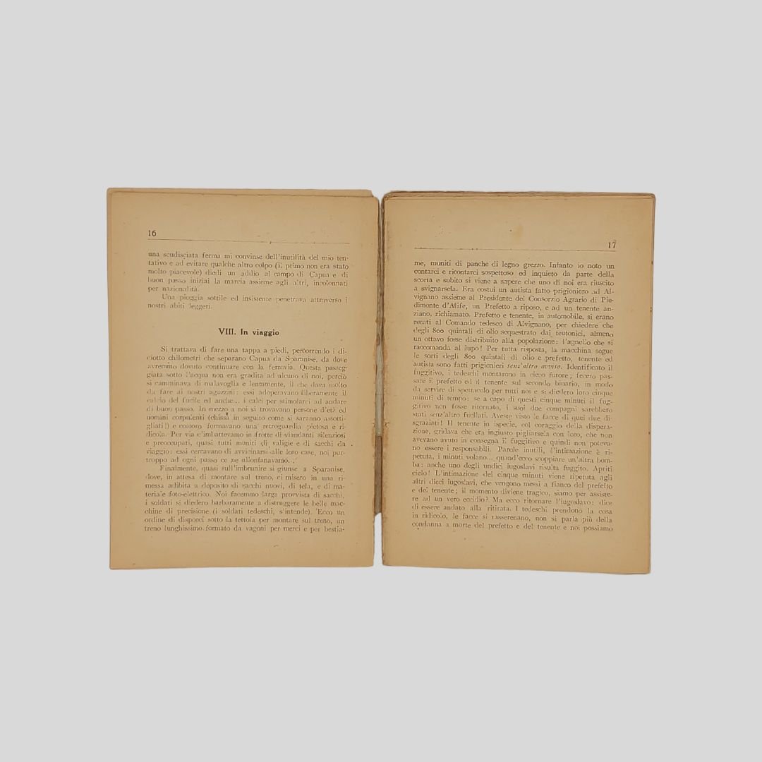 In-16 (cm 17), pp. 55. Brossura editoriale. Stampato in proprio dall’autore su carta modesta, usuale per il periodo. Fenditura al dorso. Un vero e proprio diario dalla caduta del fascismo (25 luglio 1943) al 9 luglio 1944.<BR><BR>L’autore narra in prima persona i molteplici arresti patiti in Napoli fino alla deportazione in Germania e ritorno. Un periodo complesso della storia di Napoli, tra l’armistizio dell’8 settembre 1943 e la volontà delle forze di occupazione naziste di distruggere la città partenopea, con la complicità dei fascisti napoletani. Intanto le forze alleate risalivano da sud. Un periodo di terrore e fame per la popolazione che da lì a poco avrebbe reagito alla fine di settembre con una vera e propria sollevazione popolare.<BR><BR>Le quattro giornate di Napoli (27 settembre-1 ottobre 1943) rappresentarono per la prima volta la reazione di una città all’occupazione nazifascista e valse alla città di Napoli la Medaglia d’Oro al Valor Militare.
