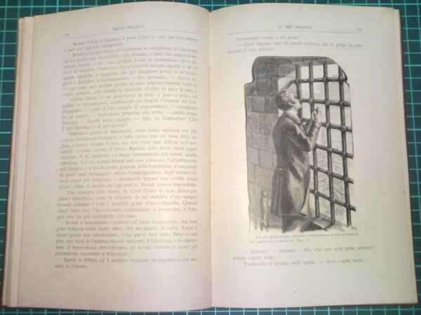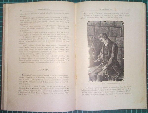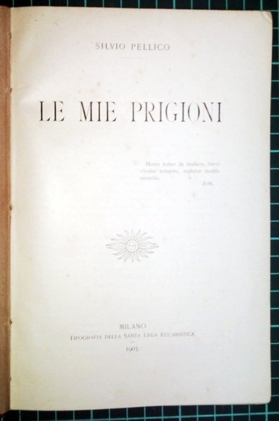 in-8° (cm 21,5 x 14,5); pp. VI, (2), 213; legatura in tela color marrone, titolo al dorso liscio a caratteri neri incisi in verticale, al piatto ant. incisione in b/n raffigurante l'Autore all'interno della prigione e decoro floreale inciso e colorato nero e oro; carte di guardia a disegni floreali; frontespizio, in caratteri b/n, con motto "Homo natus de muliere, brevi vivens tempore, repletur multis miseriis" Job; numerose illustrazioni in b/n nel testo; l'opera comprende la prefazione a cura di P. Gerardo Beccaro, i cenni storici, il proemio e il testo. Rif.: IT\ICCU\BRI\0474255 (una copia presso la Biblioteca pubblica diocesana Raffaele Ferrigno - Ostuni - BR). Cond.: qualche brunitura alle carte e leggere macchie al piatto posteriore; nel complesso buono stato di conservazione.