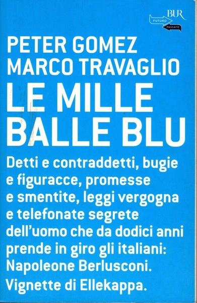 Le mille balle blu. Detti e contraddetti, bugie e figuracce, promesse e smentite, leggi vergogna e telefonate segrete dell'uomo che da dodici anni prende in giro gli italiani: Napoleone Berlusconi, prima edizione marzo 2006, pp. 475, formato 13 x 20.<BR>Copertina morbida di colore blu con titoli in bianco al piatto anteriore e sul dorso.All'interno numerose vignette illustrate di Ellekappa.<BR>Ottime condizioni.
