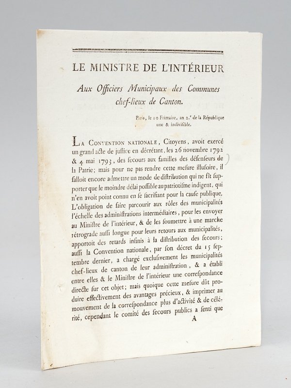 Le Ministre de l'Intérieur aux Officiers Municipaux des Communes Chef-lieux de Canton. Le 10 Frimaire an 2e de la République une et indivisible. [Décret de la Convention Nationale, du 1e Jour de Frimaire l'an 2e de la République Française, relatif aux fonds destinés à indemniser les Familles des Militaires et des Marins qui y ont droit".