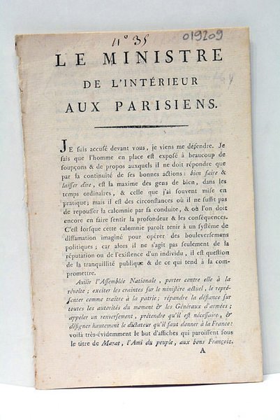 in-12. 8pp. Broché. Bon exemplaire. Justification du ministre de l'intérieur. Révolution française.