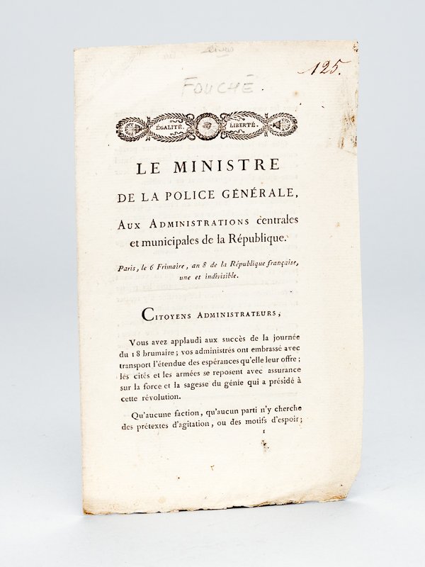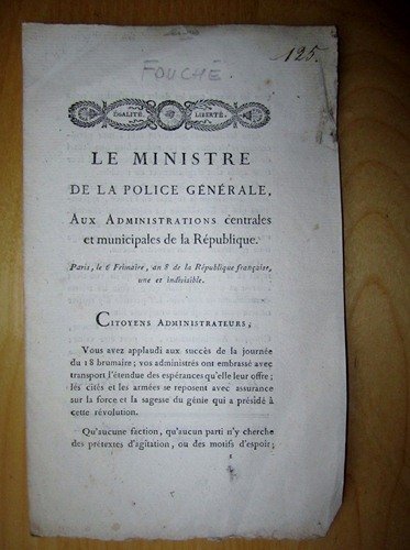 1 brochure in-12, De l'Imprimerie de la République, Paris, Frimaire An VIII [ 1799 ], 4 pp. (dont de texte) Edition originale de l'extraordinaire lettre circulaire de Joseph Fouché relative à la Journée du 18 Brumaire : 'Citoyens administrateurs, vous avez applaudi aux succès de la journée du 18 brumaire ; vos administrés ont embrassé avec transport l'étendue des espérances qu'elle leur offre ; les cités et les armées se reposent avec assurance sur la force et la sagesse du génie qui a présidé à cette révolution.' . 'Que les insensés qui furent tour-à-tour persécuteurs et victimes, se persuadent bien que l'autel de la justice est le seul asile commun qui leur reste après tant d'agitations et de troubles' . 'Que les émigrés trouvent, s'ils le peuvent, le repos et la paix loin de la patrie qu'ils voulaient asservir et détruire ; mais cette patrie les rejette éternellement de son sein. L'espérance d'y rentrer ne sera pour eux qu'une trompeuse illusion'. Bon état (annotations ms. de l'époque en première et dernière page). Tourneux, I, 5132