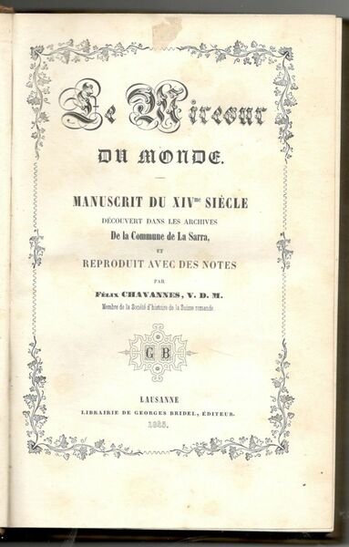 Le Mireour du Monde. Manuscrit du XIVème siècle découvert dans les archives de la Commune de La Sarra et reproduit avec des notes par Félix Chavannes.