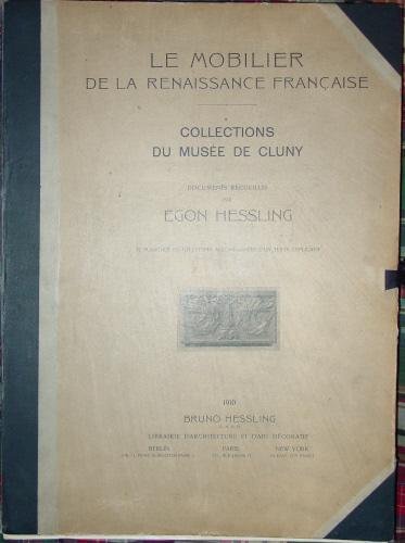 1 lingua: francese In folio, bella cartella editoriale rigida non orig. in tutta tela, cm 41x31 - contenente 72 tavole in eliotipia, ciascuna contenente due o più illustrazioni, testo introduttivo esplicativo di pag. 15, con 29 illustrazioni in b / n - 72 planches en hèliotypie accompagnèes d'un texte explicatif - 72 pp. of b / w plates of Renaissance furniture from the collection of the Musee de Cluny - senza data (1910 circa) - Perfetto stato di conservazione.
