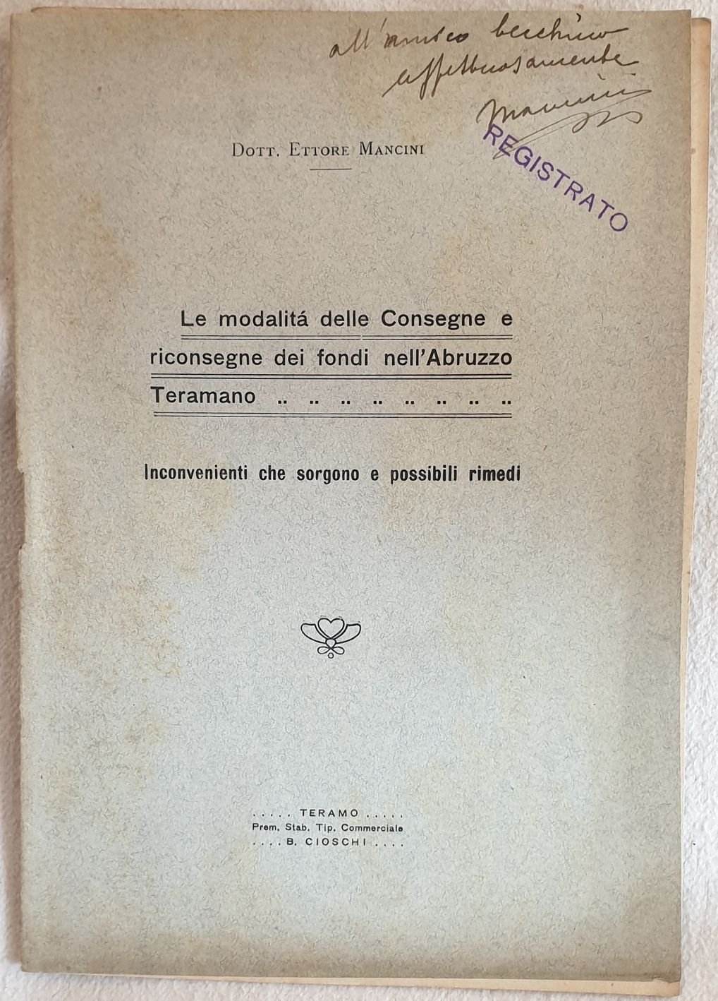 Pubblicazione senza data ma dei primi del novecento del Dott. Ettore Mancini sulle consegne e riconsegne dei fondi nell'Abruzzo Teramano. Dedica autografa dell'autore in copertina. In buone condizioni. Copertina editoriale in buone condizioni generali con lievi usure ai margini e dorso. Legatura in buone condizioni. All'interno le pagine si presentano in ottime condizioni con rare fioriture. In 8. Dim. 20,5x14,5 cm. Pp. 15. Pamphlet not dated but of early 20th century of this pamphlet by Dott. Ettore Mancini about delivery and rideliveries of land in Teramo area of Abruzzo. Authographed dedication of the author in the cover. In good conditions. Editorial cover in good general conditions slightly worn in the edges and spine. Binding in good conditions. Inside pages are in very good conditions with occasional foxings. In 8. Dim. 20,5x14,5 cm. Pp. 15.