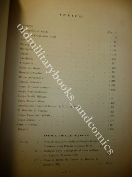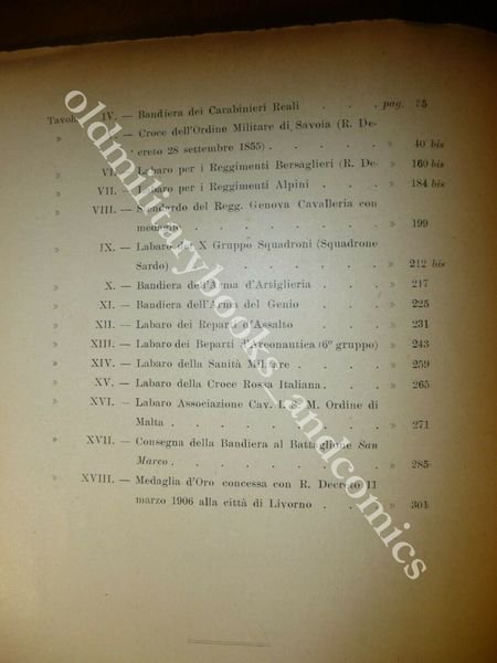 TITOLO: LE NOSTRE GLORIOSE BANDIERE RICOMPENSE DA 1848 AL 1924 RICOMPENSE ALLE VARIE ARMI, CORPI, REPARTI E SERVIZI DEL R. ESERCITO SARDO POI ITALIANO, ALLA R. MARINA, NONCHE' A CITTA' E COMUNI DAL 1848 AL 1924 DESCRIZIONE: Stabilimento Tipografico Regionale Roma 1924 br. ed. pp. 361 alcune ill. di stendardi b/n f.t. in 8°. Bellissimo e raro vol. che raccoglie tutte le decorazioni, oltre alle città, di tutti i reparti della WWI, Arditi compresi. CONDIZIONI: Ottime/Perfette lievi pieghette, piccolo distacco della cop. alla parte bassa del dorso, INTONSO. PESO / WEIGHT: 498 gr. without package