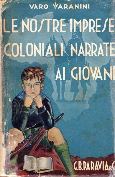 Le nostre imprese coloniali narrate ai giovani, edizione 1937, pp. 291, formato 14 x 21,5.<BR>Copertina morbida illustrata con titoli in bianco al piatto anteriore e in nero sul dorso. All'interno del volume presenti numerose tavole fotografiche in b/n. <BR>Restauro e rinforzo del dorso. Normali segni del tempo. Interno in buone condizioni.