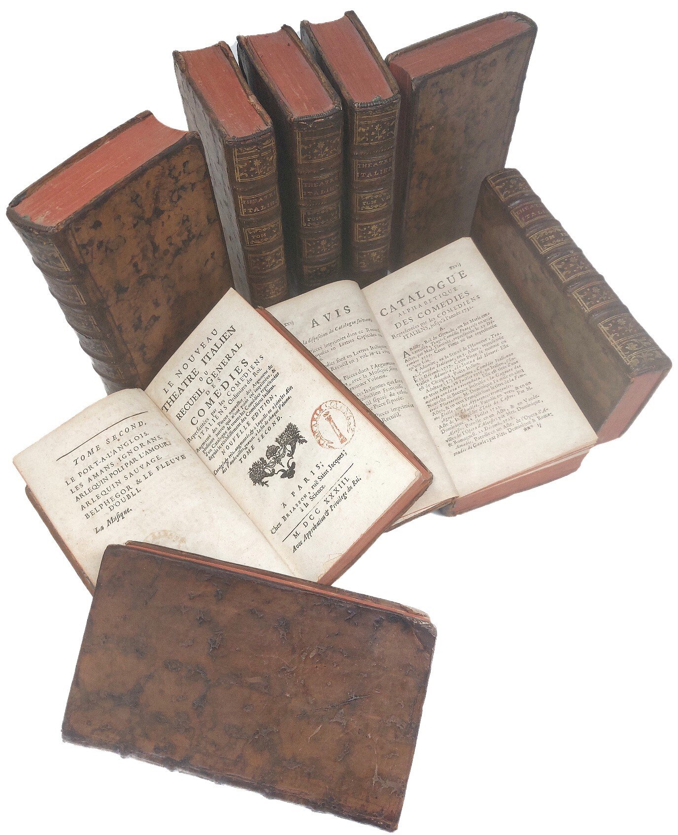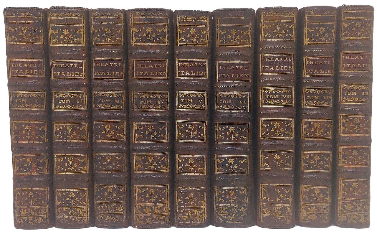 >9 vol. in-12 (170x94 mm), ciascuno di 450-500 pp., attraente legatura del tempo in pelle marmorizzata, dorsi a nervi con titoli e ricchi fregi oro, tagli rossi (qualche difetto agli spigoli e ad alcune cuffie). Importante raccolta della vasta produzione teatrale dei Comédiens Italiens dal 1716 al 1733, più una comedia (''La feinte inutile'') del 1735. Pubblicata per iniziativa del Riccoboni, la raccolta andò man mano ampliandosi e da un solo volume nel 1716, arrivò ai 10 vol. dell'ultima ediz. del 1753. In questa edizione, probabilmente la sesta, ai primi 8 vol. apparsi nel 1733, è unito il IX, voluto dall'editore nel 1736, quale ''complément de l'édition de 1733'' (cfr. De Courville, Bibliogr. de Riccoboni, p. 20, n. 63 ). Il vol. I è di particolare importanza (anche se purtroppo privo all'inizio di almeno 4 pp. in numeraz. romana, contenenti l'occhietto ed il titolo): vi sono contenuti, infatti, la ''Mémoire...sur le rétablissement des Comédiens Italiens à Paris'', l'importantissimo ''Catalogue alphabétique des comédies representées par les Comédiens Italiens jusquà l'année 1723'' (pp. XXVII-LXVII), gli ''Extraits ou Argumens de plusieurs Pièces, soit italiennes, soit françoises, qui n'ont pas été imprimées; ausquelles on a joint les Vaudevilles de toutes les pièces qui ne sont pas imprimées dans ce Recueil'' (oltre 100 brevi testi: argomento delle commedie, canovacci, vaudevilles) ed infine 100 pagine con la musica incisa di 66 vaudevilles. I vol. II-IX contengono, invece, il testo completo di 42 pièces (i cui titoli si possono leggere al verso di ciascun frontespizio) e complessive 51 pagine di musica incisa con le ''airs des vaudevilles'', che appaiono qui per la prima volta. Com'è noto, avuto l'incarico dal Reggente Duca d'Orléans, Riccoboni riunì a Parigi un'eccellente troupe e ''le Nuoveau Théâtre Italien'' iniziò le recite con lo ''Inganno fortunato'' o la ''Heureuse surprise'' il 18 maggio 1716, ''en présence du Régent et de la duchesse de Berry, sur la scène du Palais Royale''; il successo fu strepitoso. Il Riccoboni, in arte Lelio (Modena 1675 - Parigi 1753), dopo aver ottenuto da Luigi XV , per sé e per la sua troupe, ''une pension de 15.000 livres'' ed esser naturalizzato francese insieme alla moglie (la celebre attrice Flaminia) ed al figlio, proseguì felicemente l'attività di attore e scrittore fino al 1744. Esemplare genuino ed in buono stato (nonostante la mancanza di quatro pp. all'inizio del primo volume, di cui occhietto e titolo), timbri in rosso della Libreria Colonna ed ex-libris di Bruno Brunelli Bonetti, bruniture e arrossature sparse. De Courville, Bibliogr. de Riccoboni, p. 19-20, n. 63 e 66. Duchartre, p. 104 e segg. Soleinne III, p. 155 e n. 3361 (ediz. 1753). Rasi, I Comici ital. I, pp. 348-355. Encicl. Spettacolo VIII, 940-943.