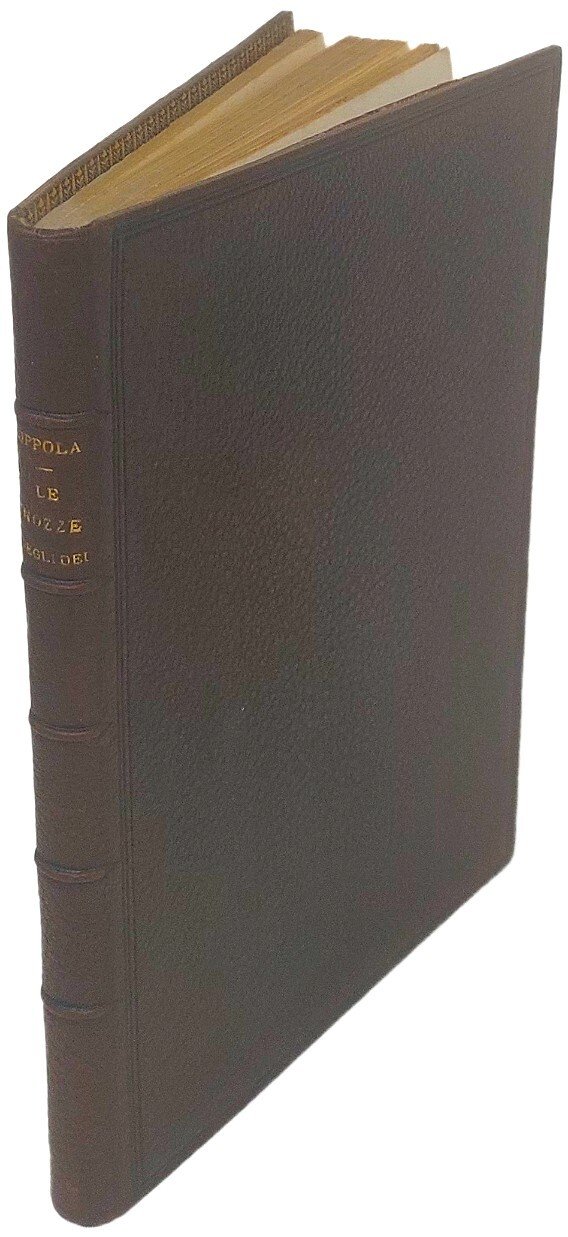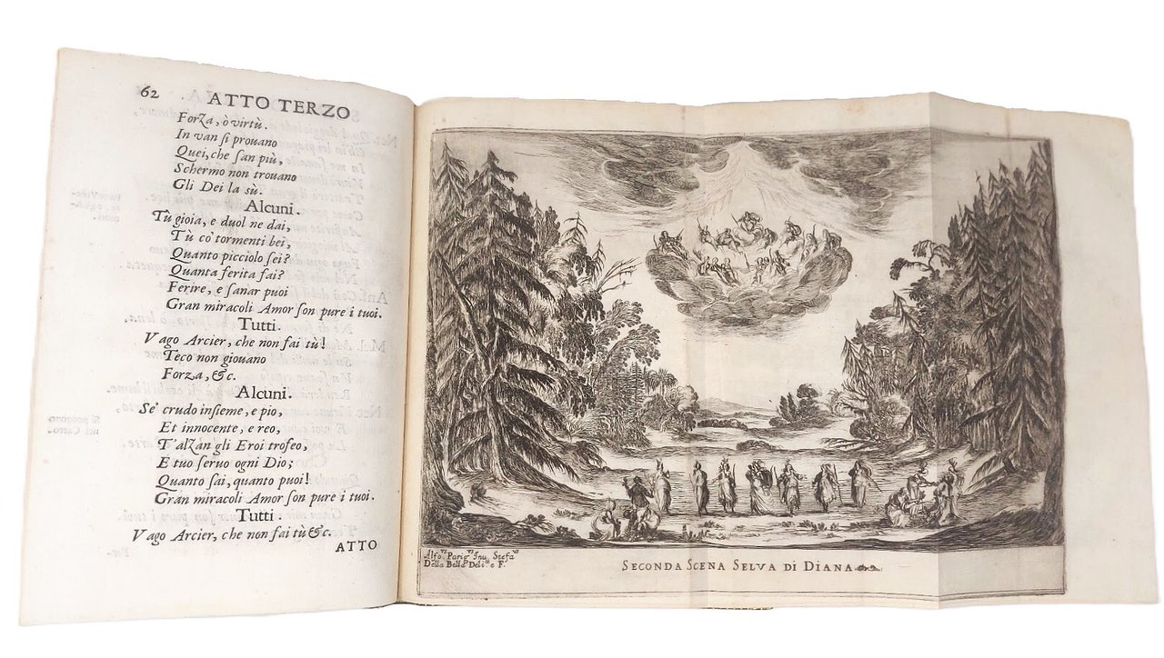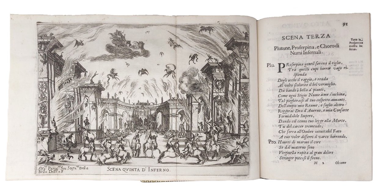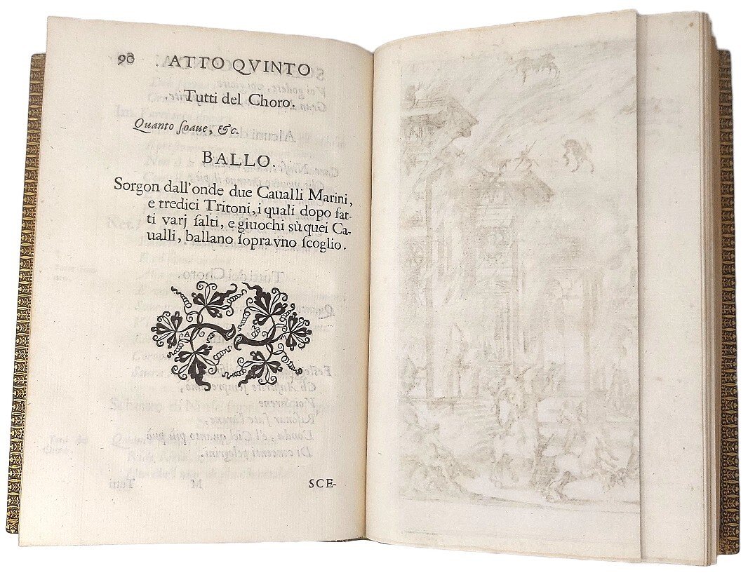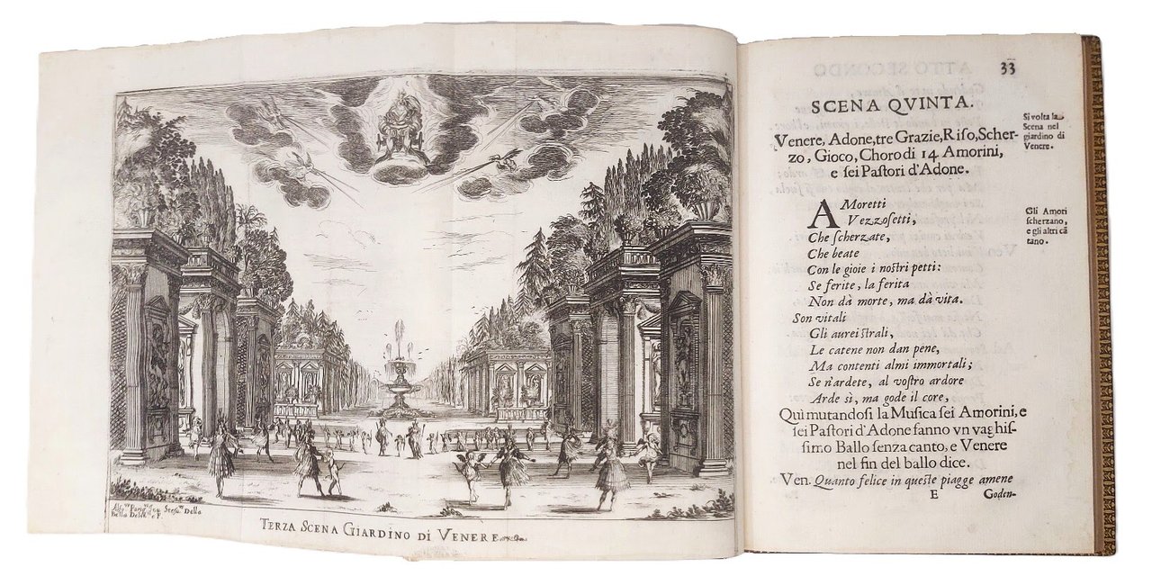 >2 parti in un vol. in-4, (mm 224x158), pp. (8),104; 50, (2). Legatura d'amatore novecentesca in pieno marocchino marrone, titolo oro al dorso a 5 piccoli nervi, dentelles interne, tagli dorati. Stupendamente illustrato da 1 frontespizio figurato e 7 tavole su doppia pag. f.t. incise da Stefano Della Bella su disegni di Alfonso Parigi; iniziali istoriate e fregi silografici ad ornare il testo. Il frontespizio raffigura un teatro sulla cui scena si vedono due mappamondi sospesi e, in platea, una folla di spettatori. Le tavole raffigurano una campagna con veduta di Firenze sullo sfondo, la foresta di Diana, i giardini di Venere, il mare, i cieli, l'inferno e la fucina di Vulcano. Celebre festa teatrale per nozze, unica e rara edizione. Propone il testo della favola e la spiegazione degli apparati di Alfonso Parigi e la rappresentazione del teatro gremito (probabilmente allestito in Palazzo Pitti) nell'antiporta, che forniscono preziose indicazioni per la storia dell'arte scenografica del XVII sec. Il Coppola (1599-1651) fu il librettista di una favola sul matrimonio tra gli dei Venere e Vulcano, Giove e Giunone (in cielo), Nettuno e Anfitrite (nel mare) e Plutone e Proserpina (negli inferi). La produzione contava circa 150 cantanti: la musica fu curata da Marco da Gagliano, maestro di cappella della corte medicea, ma in realtà furono cinque i compositori incaricati di contribuire, con Ferdinando Saracinelli, alla direzione. Agnolo Ricci fu il coreografo dei diversi balli che accompagnano il dramma. La seconda parte è una descrizione, attribuita a Rondinelli, della produzione nel suo complesso, della prima scenotecnica operistica. Questo sembra essere il primo uso registrato della parola “opera” per indicare un dramma musicale. Bell'esemplare: benché le tavole siano molto marginose, il frontespizio risulta lievemente rifilato in alto lungo il lat destro. Ex libris nobiliare al contropiatto R. Grottanelli Ugurgieri, famiglia senese le cui origini vengono fatte risalire alla grande consorteria feudale dei Berardenghi di origine salica. Stemma dorato con tre leoni azzurri: i due del capo affrontati e sostenenti una ruota di otto raggi di rosso, sormontato da cimiero e corona. Ruggeri 796 (con sole 3 tav.). Vesme- Massar, D.Bella, 918-925. Cicognara 1445. Nagler, Theatre Festivals of the Medici, 162-174. Solerti p. 197-201.