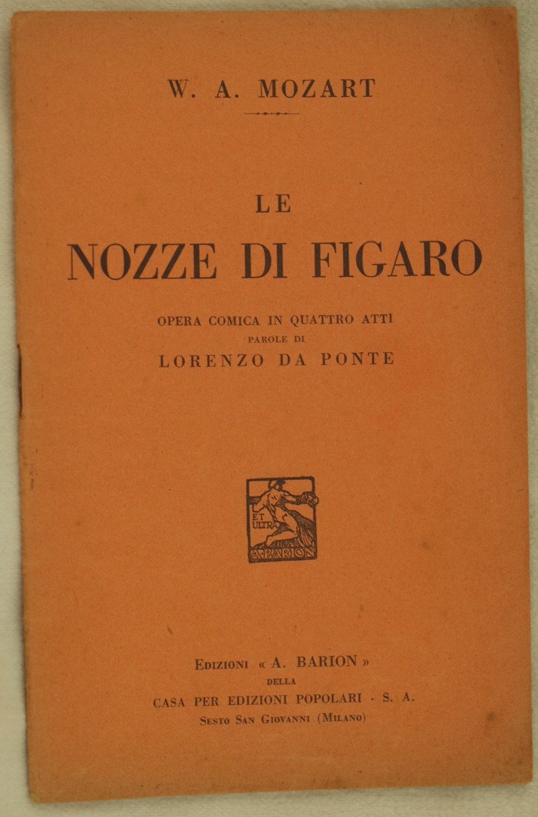 In 16. Dim. 18,5x12 cm. Pp. 32. Bel libretto d'opera del 1934 dell'opera "Le nozze di Figaro" di Wolfgang Amadeus Mozart (1756-1791) su libretto di Lorenzo da Ponte.<BR>La prima rappresentazione ebbe luogo il 1 maggio 1786.<BR>In buone condizioni Brossura editoriale in buone condizioni generali con lievi usure ai margini e dorso. Macchie. Legatura in buone condizioni. All'interno le pagine si presentano in buone condizioni con fioriture.Beautiful booklet of 1934 of the work "Le nozze di Figaro" by Wolfgang Amadeus Mozart (1756-1791) on booklet by Lorenzo da Ponte. The first representation took place the 1st of may 1786. In good conditions Editorial cover in good general conditions slightly worn in the edges and spine. Stains. Binding in good conditions. Inside pages are in good conditions with foxings.