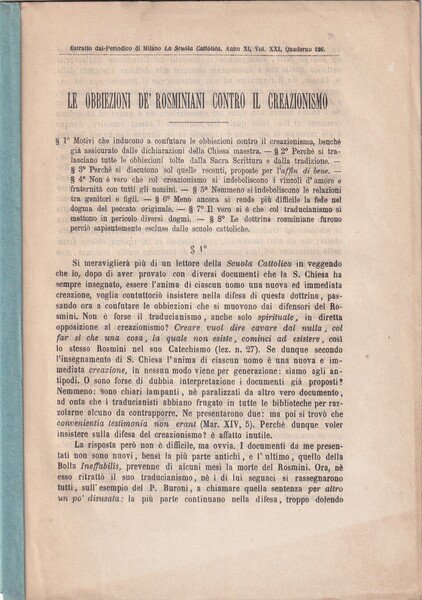 *Le obbiezioni de Rosminiani contro il Creazionismo.