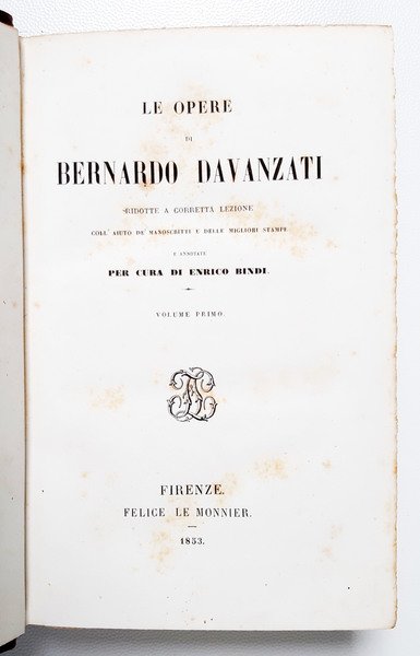 Le opere di Bernardo Davanzati ridotte a corretta lezione coll'aiuto de' manoscritti e delle migliori stampe e annotate per cura di Enrico Bindi. Volume primo [-secondo].