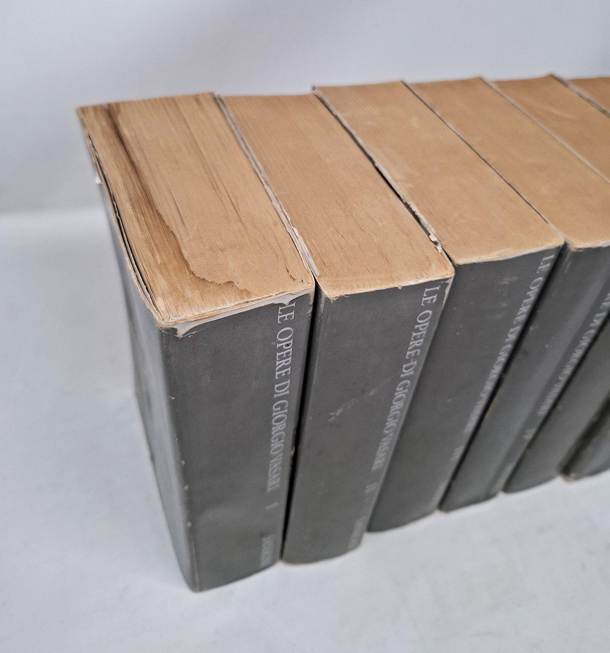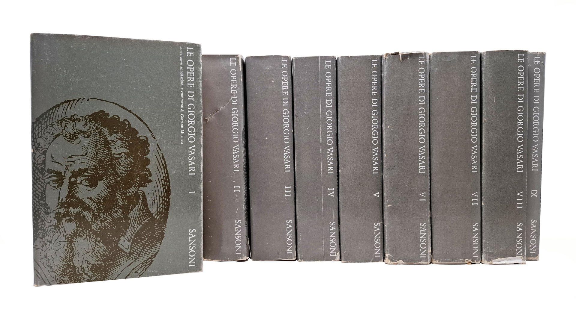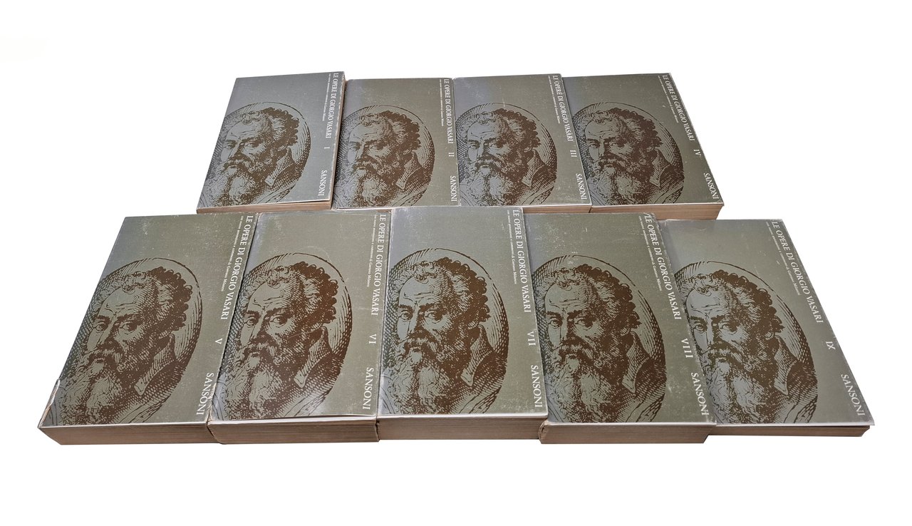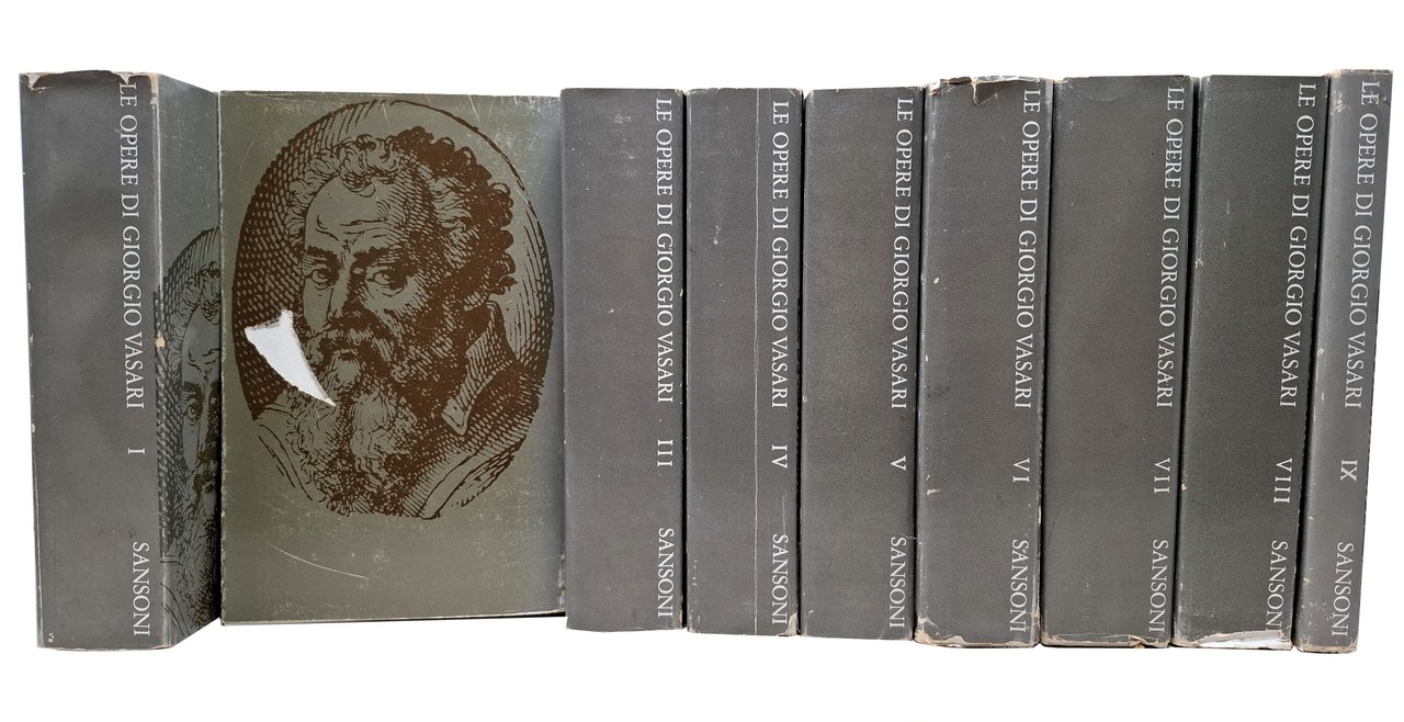 Con annotazioni e commenti di Gaetano Milanesi. Presentazione di Paola Barocchi. Sansoni Editore, 1973. Serie: Superbiblioteca Sansoni. Opera completa in IX volumi. Pagine: XVII + VIII + 698 (volume I); 692 (volume II); 714 (volume III); 654 (volume IV); 660 (volume V); 662 (volume VI); 729 (volume VII); 629 (volume VIII); 267 + [3] (volume IX). Ristampa dell'edizione del 1906. Stato di conservazione: il volume primo ha subito una pregressa umidità sull'ultimo centinaio di pagine (queste si presentano con lievi grinze ed è presente un alone sui tre lati dell'unghia del volume, in corrispondenza di questo blocco di pagine), le sovraccoperte presentano qualche difetto (su alcune sono presenti mancanze e qualche escoriazione e taglietto, qualche piega sulle linguette), margini delle pagine leggermente bruniti ma, nel complesso, un insieme sicuramente buono. Copertine editoriali flessibili con sovraccoperte. I primi sette volumi di quest'opera contengo 'le vite de' più eccellenti pittori scultori ed architettori', il volume ottavo contiene 'i ragionamenti', le lettere e un'appendice con la 'descrizione dell'apparato fatto in Firenze per le nozze dell'illustrissimo ed eccellentissimo Don Francesco De' Medici principe di Firenze e di Siena e della Serenissima Regina Giovanna D'Austria', mentre l'ultimo volume raccoglie gli indici ('tavola alfabetica delle vite degli artefici', 'tavola de' nomi delle persone' e 'tavola dei luoghi e delle cose').