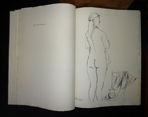 In-folio (cm 53,5 x 37), leg. in mezza pelle con tit. in oro, 7 nervi e marchio editoriale al dorso, piatti in legno, pp. 94(6). I disegni di Manzù sono stampati a piena pagina, nel testo, in nero. Il primo, color sanguigna, è posto come antiporta. Bellissima, raffinata edizione numerata di 999 esemplari (il nostro n° 610), stampata su carta di Fabriano, della collezione 'Il Tridente', ideata e diretta da Enzo Crea. Con la custodia editoriale. Esemplare perfetto.