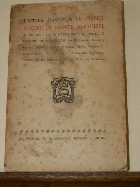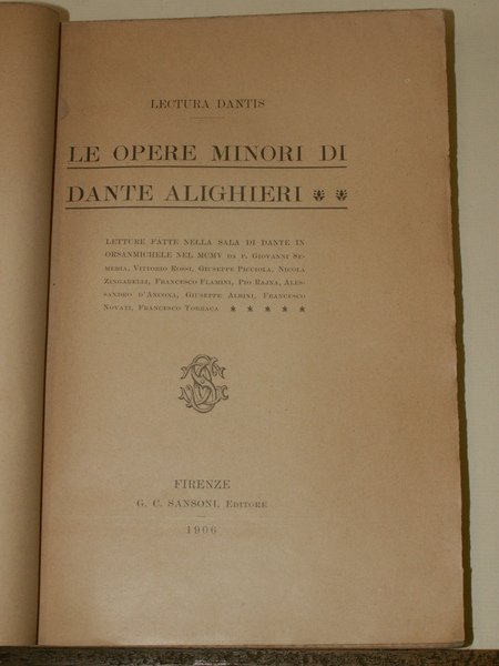 Volume in 8 grande, brossura editoriale, titolo stampato a due colori al piatto ed al dorso, sguardie, occhiello, frontespizio, 340 pp., indice. Letture fatte nella sala di Dante in Orsanmichele da G. Semeria, V. Rossi, G. Piccila, N. Zingarelli ed altri sulle opere minori di Dante. Lieve brunitura della carta, fioriture alla legatura. In buono stato, di difficile reperibilit.