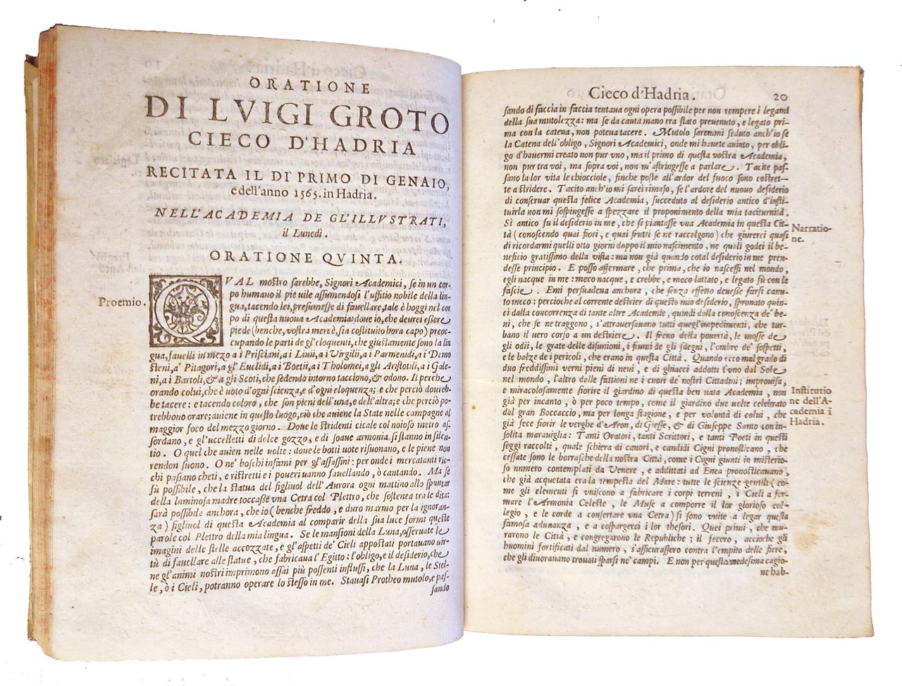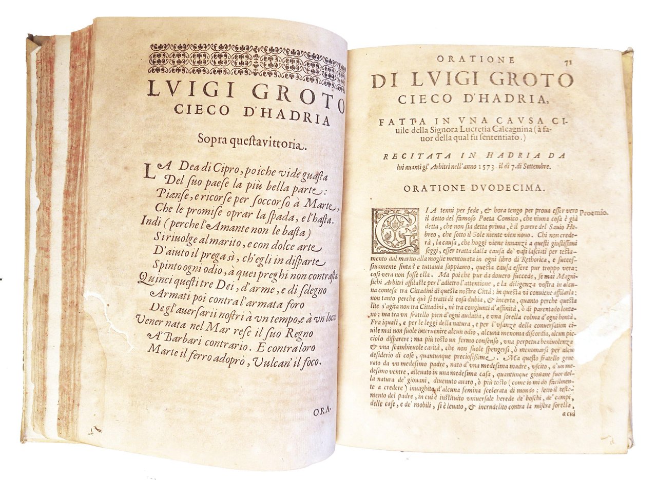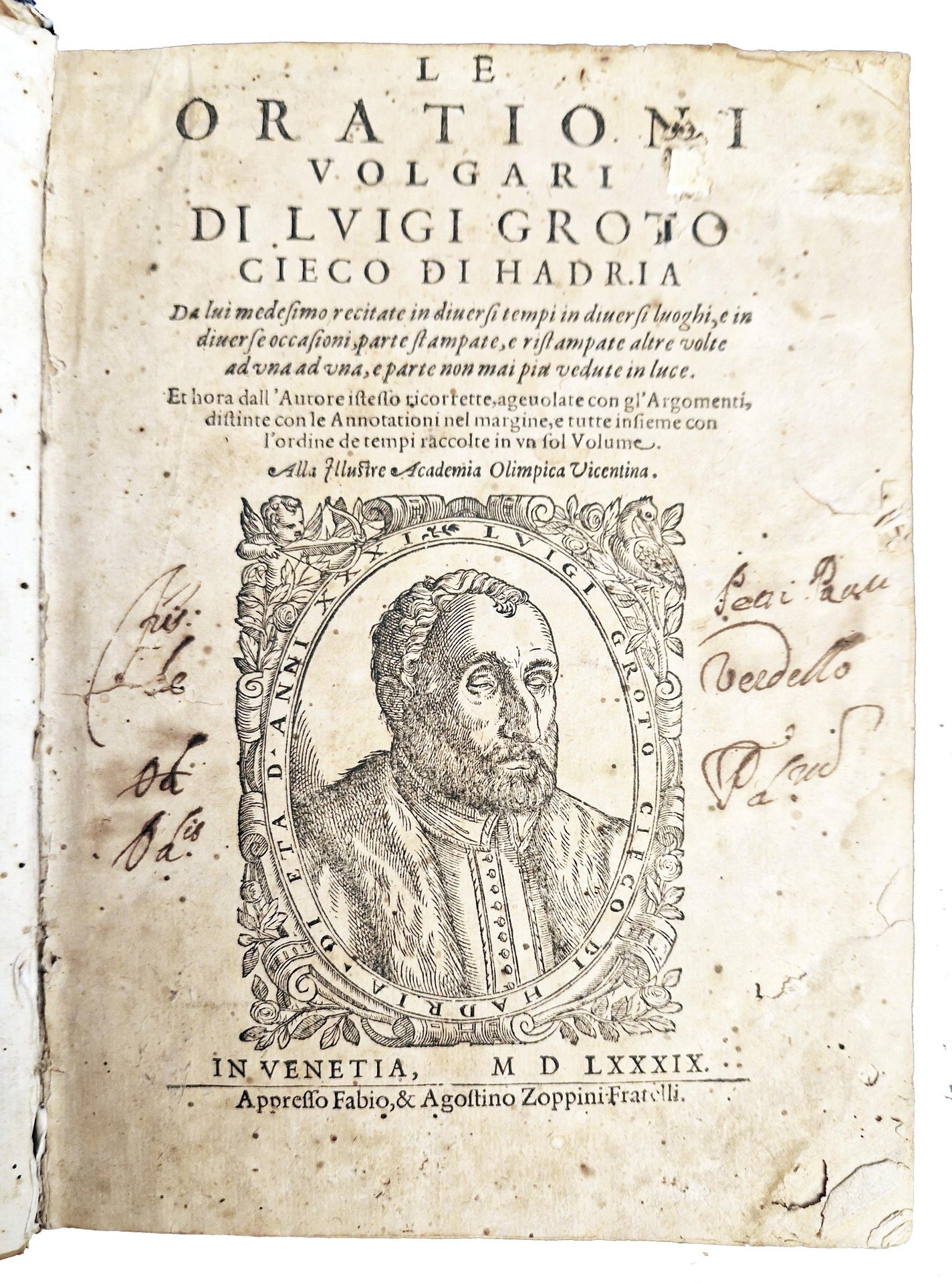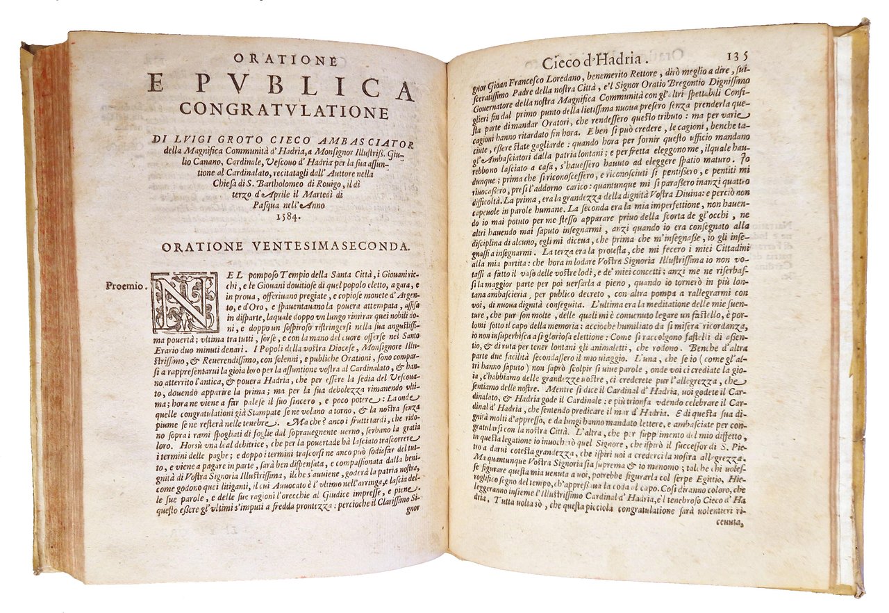 in-4°, 204x148 mm, leg. in pergamena con titolo manoscritto al dorso, tagli colorati di rosso a spruzzo; [4], 151 [i.e. 152] carte; la carta 2P4 risulta erroneamente num. 151 anziché 152. Ritratto xil. Sul frontespizio. Seconda ed. (la prima è del 1586) di questa raccolta di orazioni in Italiano (solo la ventiquattresima orazione è in latino) a cura di Luigi Groto (1541-1585; drammaturgo). Prov.: Presenza di iscrizioni d'appartenenza manoscritte al frontespizio. Rif.: IT\ICCU\BVEE\016344. CNCE 21901. OCLC, 954868446. Cond.: Legatura in condizioni molto buone. Leggero difetto al frontespizio (un piccolo foro vicino al titolo, restaurato dal retro, e parziale perdita della lettera N di "Orationi"). Presenza di bruniture e aloni d'umido a numerose carte. Tracce di vecchi restauri ad alcune carte. Esemplare nel complesso in buone condizioni.