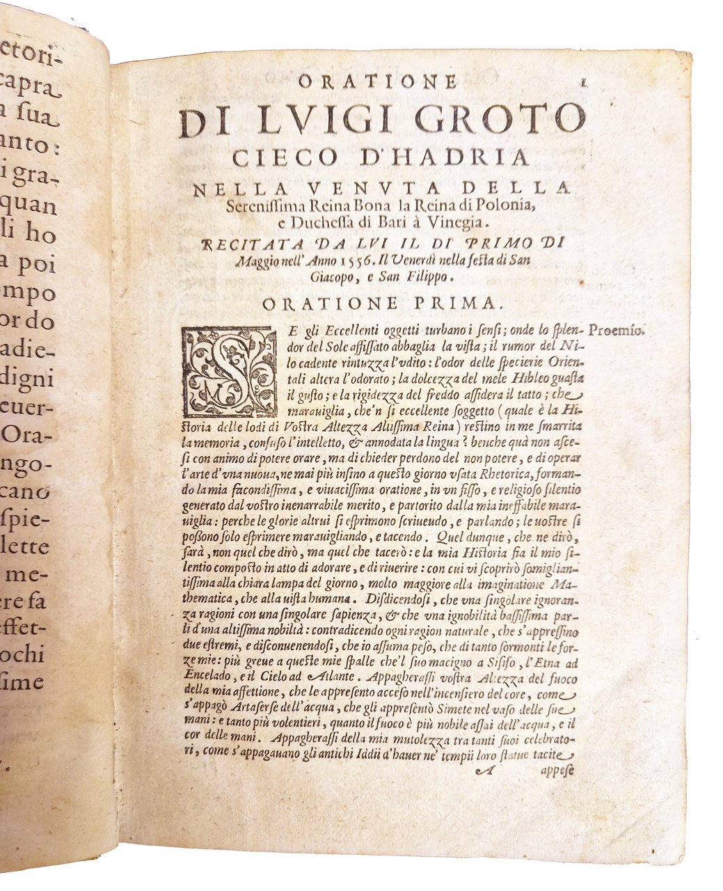 Le orationi volgari di Luigi Groto cieco di Hadria da lui medesimo recitate in diuersi tempi in diuersi luoghi, e in diuerse occasioni, parte stampate, e ristampate altre volte ad vna ad vna, e parte non mai più vedute in luce. Et hora dall' Autore istesso ricorrette, ageuolate con gl'argomenti, distinte con le annotationi nel margine, e tutte insieme con l'ordine de tempi raccolte in vn sol volume.