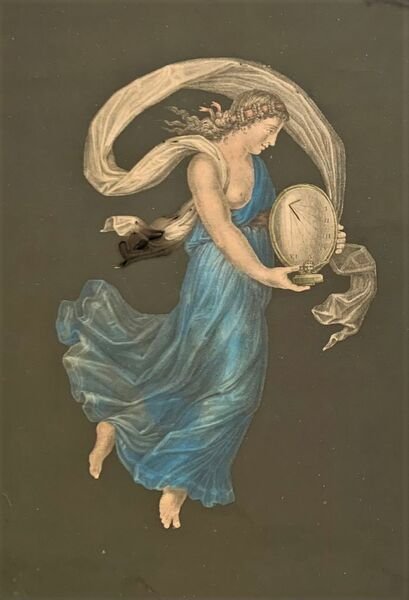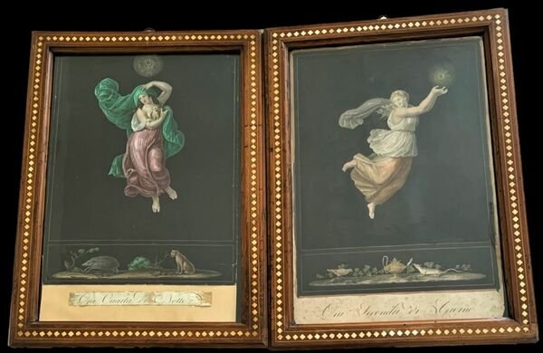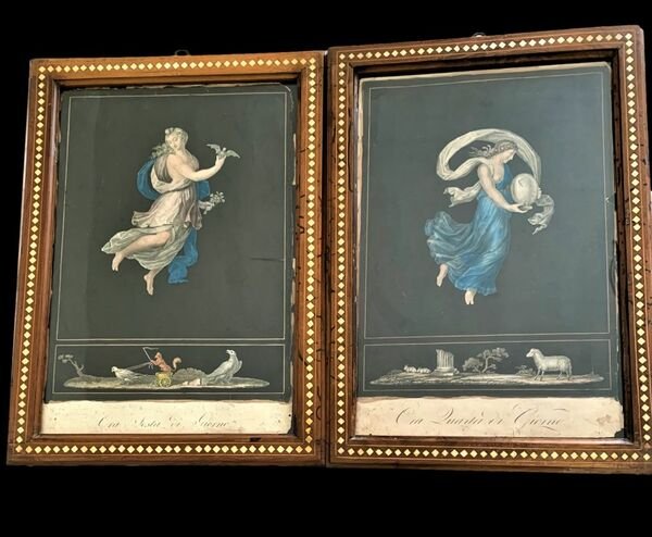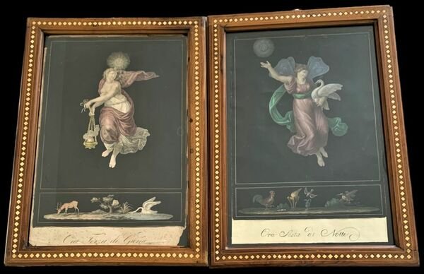 42,5×28,5 cm; rarissimo insieme di tutte e 12 le tavole tratte dalle Ore del giorno e della notte di Raffaello Sanzio. Testo in italiano sotto ogni incisione. Bellissima e fine coloritura coeva. Ogni tavola è inserita in una cornice ottocentesca con intarsi in osso. La maggior parte delle stampe presenta una lieve scritta a matita, chiaramente coeva, con le indicazioni dei colori da utilizzare per colorare la stampa. A parte i difetti sotto riportati, le stampe so presentano in buone condizioni.Qualche difetto. Ora prima di Giorno: una piccola mancanza allangolo alto. Due piccoli segnetti di piega ai margini, ininfluenti. Ora seconda di Giorno: due piccoli, ininfluenti, strapetti al margine esterno, senza perdita di carta. Ora terza di Giorno: Piccole mancanza di carta agli angoli, nel margine esterno bianco e ai lati della stampa, non particolarmente significativi.Ora quarta di Giorno: qualche piccola mancanza di carta al margine esterno bianco, ed una piccola mancanza di carta che tocca la parte esterna, non particolarmente significativo.<BR>Ora quinta di Giorno: un lievissimo difetto con piccolissima perdita di carta al margine alto ed uno strappetto senza perdita di carta al margine esterno, tutti e due ininfluenti.Ora sesta di Giorno: Lievi mancanza di carta al margine esterno bianco ed uno strappetto abilmente restaurato, non particolarmente significativi.Ora prima di Notte: Piccole mancanza di carta ai margini esterni bianchi, uno strappo senza perdita di carte restaurato abilmente.Ora seconda di Notte: due piccole mancanze al margine basso bianco, ininfluentiOra terza di Notte: Mancanza di circa un centimetro di carta al margine alto.Ora quarta di Notte: una piccola mancanza allangolo alto destro, uno strappetto senza perdita di carta abilmente restaurato. Mancanza nella parte bassa della stampa (immagine completa), quella parlata dove però è stata conservata, proprio, la parte parlata.Ora quinta di Notte: due piccolissime mancanze al margine basso bianco, ininfluenti.Ora sesta di Notte: immagine completa, manca la parte bassa parlata che è stata anticamente integrata a mano riprendendo la scrittura delle altre incisioni. Un piccolissimo forellino al margine alto al centro, probabilmente dove la stampa era stata attaccata.Raffaello si ispirò per la realizzazione di questa serie da originali, reperiti a Pompei e conservati presso il Museo di Napoli (come visibile sulla collezione On-line dellHarvard College). La serie edita da Beaublé è reperibile e consultabile, in alta definizione, presso il sito del British Museum.Le figure femminili drappeggiate, si sviluppano su uno sfondo scuro. In basso ogni incisione presenta unimmagine con animali, piante e ed oggetti di chiaro gusto pompeiano. Le tavole sono rare ma rarissimo è trovare un set completo.
