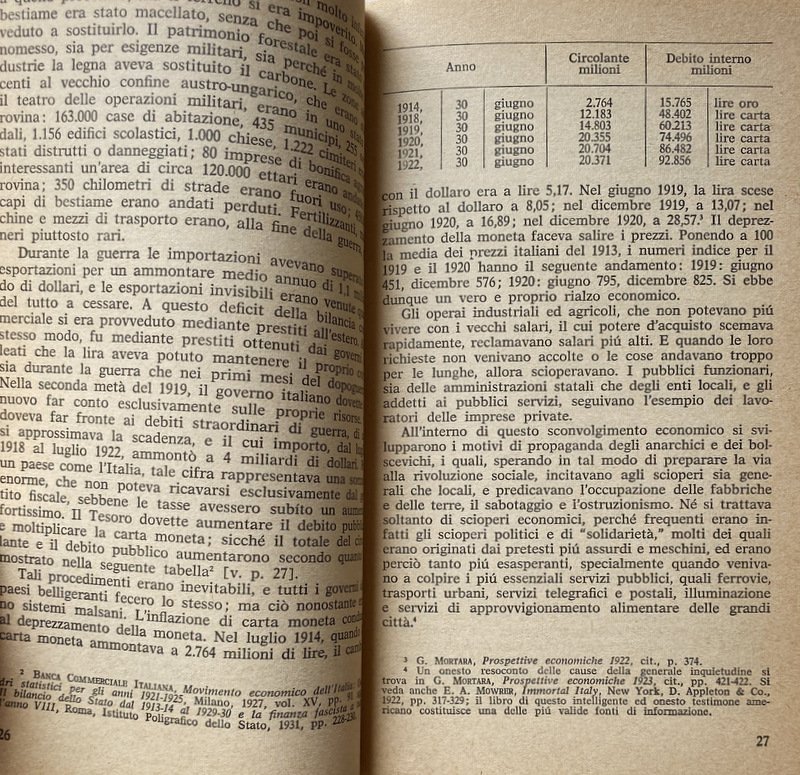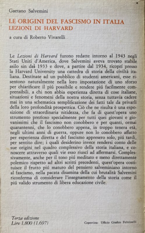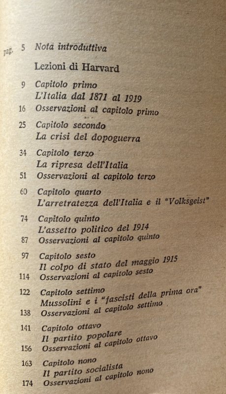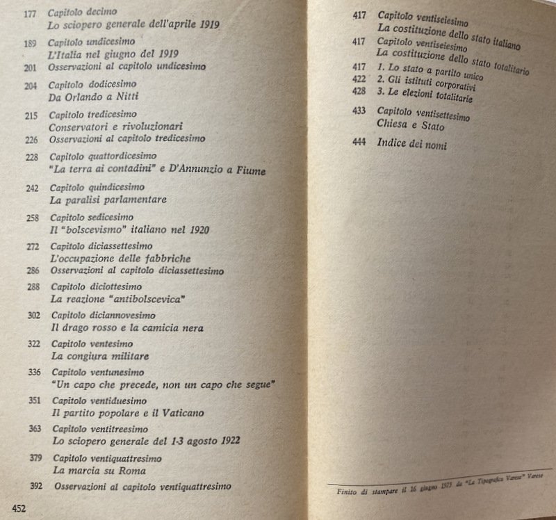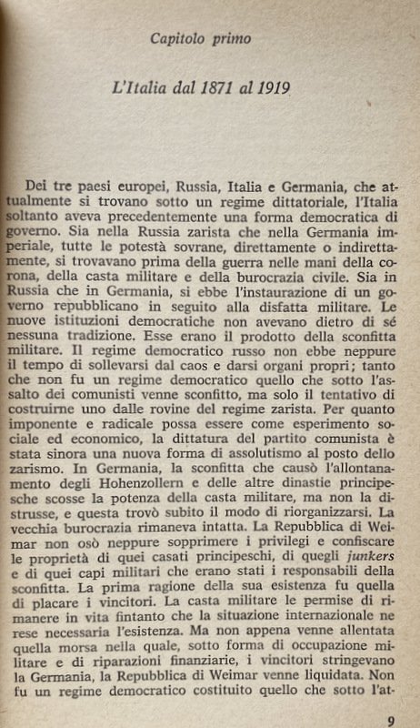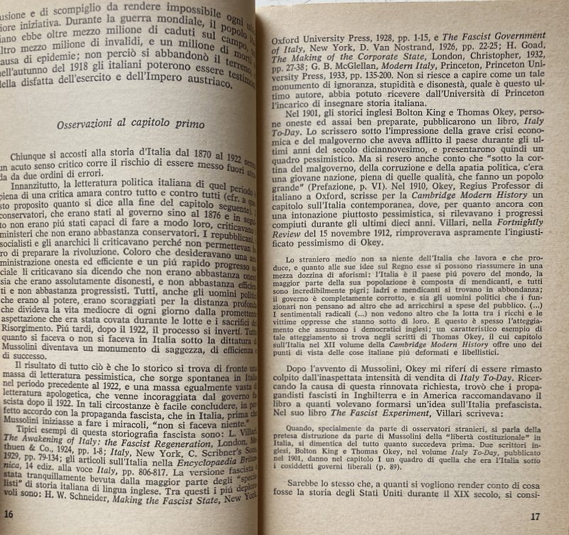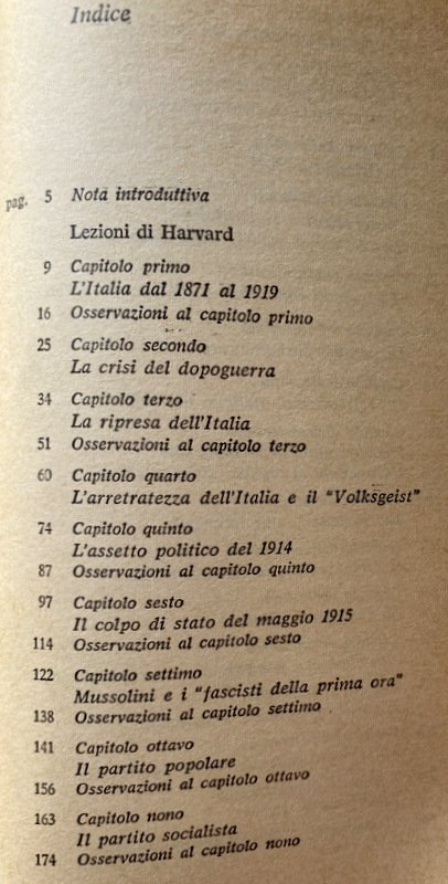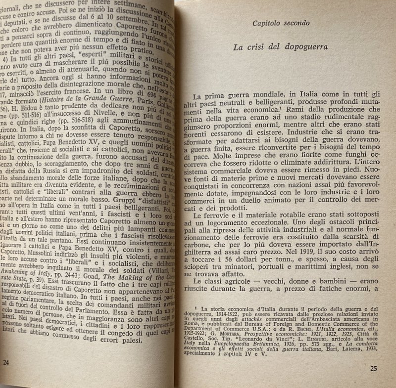 Soggetti: Storia d'Italia, Lezioni universitarie, Corsi, Storiografia, Biografie, Europa, Storia contemporanea, Novecento, Ideologie politiche, Periodi storici, XX secolo, Politica, Società, Teorie, Nazionalismo, Crisi, Dopoguerra, Guerre Mondiali, Seconda Guerra Mondiale, Fascismo, Nazismo, Dittatura, Regime fascista, Ventennio, Squadrismo, Borghesia, proletariato, Socialismo, Anticomunismo, Unione Sovietica, Russia, Germania, Francia, Inghilterra, America, Aventino, Intellettuali, Consenso, Dissenso, Confino, Esilio, Ebrei, Antisemitismo, Democrazia, Camicie nere, Violenza, Repressione, Libertà, Liberazione, Resistenza, Partigiani, Costituzione, Badoglio, Armistizio, Benito Mussolini, Duce, Galeazzo Ciano, Winston Churchill, Stalin, Stalinismo, Adolf Hitler, Alleati, Sbarco, Africa, Libia, Albania, Eritrea, Irredentismo, Etiopia, Abissinia, Occupazione, Protezionismo, Colonialismo, Imperialismo, Colonie, Amministrazione, Burocrazia, Elezioni, Discorsi, Scritti, Diario, Fonti, Bibliografia, Riferimento, Consultazione, Collezionismo, Classici, Claretta Petacci, Marcia su Roma, Movimento operaio, Volksgeist, Colpo di Stato, Arretratezza, Ottocento, Zarismo, Imperi, Fascisti, Partiti politici, Partito Popolare, Weimar, Riparazioni, Conservatorismo, Orlando, Nitti, Gabriele D'Annunzio, Istria, Dalmazia, Trieste, Fiume, Jugoslavia, Massa, Contadini, Campagna, Analfabetismo, Bolscevichi, Drago rosso, Camicia Nera, Simbolismo, Chiesa, Papa, Vaticano, Concordato, Corporazioni, Totalitarismo, Campi di concentramento, Fabbriche, Rivoluzione, Marxismo, Lotta di classe, Riformismo, Massimalismo, Pacifismo, Manifestazioni, Scioperi, Stampa, Editoria, Populismo, Popolo d'Italia, Potere, Geopolitica, Piazzale Loreto, Libri Vintage fuori catalogo, Giudizio storico, Giorgio La Piana, Angelo Tasca, Scritti politici, Opere generali, Junkers, Industria bellica, Armamenti, Militarismo, Capitalismo, Finanza, Banche, Banchieri, Competizione, Grandi Potenze, Risorse energetiche, Commercio, Privilegi, Hohenzollern, impero austro-ungarico, Lloyd George, Wilson, Chamberlain, Sydney Sonnino, Relazioni internazionali, Clemenceau, Lenin, Esercito, Diplomazia, Brigantaggio, Sud, Ferrovie, Gaetano Volpe, Liberalismo, Revisionismo, Apologetica, Letteratura, Razza, Italy To-Day, Thomas Okey, Pasquale Villari, Meridionalismo, V. Peglion, Bonifiche, Terre, Proprietà, Paludi, Calanchi, Architettura fascista, Agricoltura, Economia, Margot Hentze, Caporetto, Luigi Cadorna, Sconfitte, Battaglie, Soldati, Ribellioni, Ammutinamenti, Fronte, Tedeschi, Adua, Francesco Crispi, Propaganda, Piave, 1922, Mercato, Debito, Università, 1929, Delitto Matteotti, Stato totalitario, Critica, Saggistica, Saggi storici, Crisi, Rivoluzione, Controrivoluzione, Dopoguerra, Guerra civile, Polizia, Comunisti, 1921, Gerarchia ecclesiastica, Colpo di mano, Masse, History of Italy, University lectures, Courses, Historiography, Biographies, Europe, Contemporary history, 20th century, Political ideologies, Historical Politics, Society, Theories, Nationalism, Crisis, Postwar, World Wars, Second World War, Fascism Nazism, Dictatorship, Fascist regime, Squadrism, Bourgeoisie, Proletariat, Socialism, Anti-communism, Soviet Union, Germany, France, England, Aventine, Intellectuals, Consensus, Dissent, Confinement, Exile, Jews, Anti-Semitism, Democracy, Blackshirts, Violence, Repression, Freedom, Liberation, Resistance, Partisans, Constitution, Armistice, Stalinism, Allies, Disembarkation, Libya, Irredentism, Ethiopia, Abyssinia, Occupation, Protectionism, Colonialism, Imperialism, Colonies, Administration, Bureaucracy, Elections, Speeches, Writings, Diary, Sources, Bibliography, Reference, Consultation, Collecting, Classics, March on Rome, Labor Movement, Coup d'état, Backwardness, Nineteenth Century, Czarism, Empires, Fascists, Political Parties, Popular Party, Reparations, Conservatism, Dalmatia, Yugoslavia, Mass, Peasants, Campaign, Illiteracy, Bolsheviks, Red Dragon, Black Shirt, Symbolism, Church, Pope, Vatican, Concordat, Corporations, Totalitarianism, Concentration Camps, Factories, Revolution, Marxism, Struggle class, Reformism, Maximalism, Pacifism, Demonstrations, Strikes, Press, Publishing, Populism, People of Italy, Power, Geopolitics, Out-of-print books, Historical judgement, Political writings, General works, War industry, Armaments, Militarism, Capitalism, Finance, Banks, Bankers, Competition, Great Powers, Energy resources, Commerce, Privileges, Austro-Hungarian Empire, International relations, Army, Diplomacy, Banditry, South, Railways, Liberalism, Revisionism, Apologetics, Literature, Race, Reclamations, Lands, Properties, Swamps, Fascist architecture, Agriculture, Economy, Defeats, Battles, Soldiers, Rebellions, Mutinies, Front, Germans, Market, Debt, Universities, Crimes, Totalitarian state, Criticism, Non-fiction, Historical essays, Crises, Revolution, Counter-revolution, Postwar period, Civil war, Police, Communists, Church hierarchy, Coup d'état, Masses, Cilibrizzi, Benedetto Croce