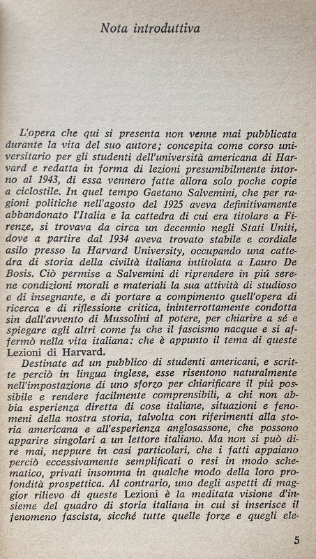 Le Lezioni di Harvard furono redatte intorno al 1943 negli Stati Uniti d'America, dove Salvemini aveva trovato stabile asilo sin dal 1933 e dove, a partire dal 1934, ricoprì presso la Harvard University una cattedra di storia della civiltà italiana. Destinate ad un pubblico di studenti americani, esse risentono naturalmente nella loro impostazione di uno sforzo per chiarificare il più possibile e rendere più facilmente comprensibili, a chi non abbia esperienza diretta di cose italiane, situazioni e fenomeni della nostra storia, senza tuttavia cadere mai in una schematica semplificazione dei fatti tale da privarli della loro profondità prospettica. Ciò che ne risulta è una esposizione di straordinaria nitidezza, che fa di quest'opera uno strumento prezioso specialmente per tutti quei giovani e giovanissimi che il fascismo non conobbero e per quanti, ormai quarantenni, che lo conobbero appena, in troppo tenera età, negli ultimi anni di guerra, oppure non lo conobbero affatto per esperienza diretta e del fascismo appresero solo, più tardi, per sentito dire; i quali desiderino invece rendersi conto delle sue origini nel quadro complessivo della storia italiana, e conoscere attraverso quali vie esso riuscì ad affermarsi. Complessivamente, anche per il tono più meditato e meno direttamente polemico rispetto ad altri scritti precedenti, quest'opera costituisce il frutto più maturo del pensiero salveminiano intorno al fascismo, nella pacata disamina della cui brutalità Salvemini riconferma di considerare l'insegnamento della storia come il più valido strumento di libera educazione civile.