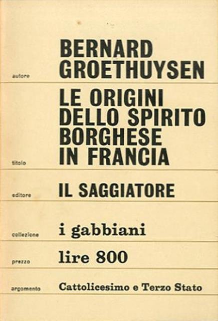 351 p. ; 17 x 12 cm. I Gabbiani. Titolo originale dell'opera: "Origines de l'esprit bourgeois en France". Traduzione di Alessandro Forte. Brossura editoriale, coperta in cartoncino flessibile in b/n. Codice libreria 1905.