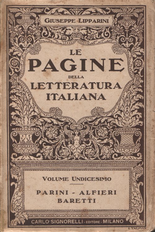 In-16°, pp. 263, (1), copertina editoriale con alcune tracce d'uso e del tempo. Firma di appartenenza a penna nel margine superiore di pagina 5. Normale patina del tempo alle pagine, con leggere arrossature ai margini dovute al tipo di carta; qualche sporadico segno d'umido, per il resto buon esemplare. Indice: Prefazione; Parini. I. Dalle "Odi"; II. Dal "Giorno"; III. Poesie varie. Alfieri. I. Pagine della "Vita"; II. Dalle "Rime"; III. Dal "Misogallo"; IV. Dagli "Epigrammi"; V. Dalle "Satire"; VI. Dalle "Tragedie"; VII. Da "L'Etruria vendicata"; VIII. Dai libri "Del Principe e delle Lettere"; IX. Dai libri "Della tirannide"; X. Dai "Giornali"; XI: Dalle "Lettere". Baretti. I. Da "La frusta letteraria"; II. Dalle "Lettere familiari ai fratelli"; III. Dalla "Scelta di lettere familiari".