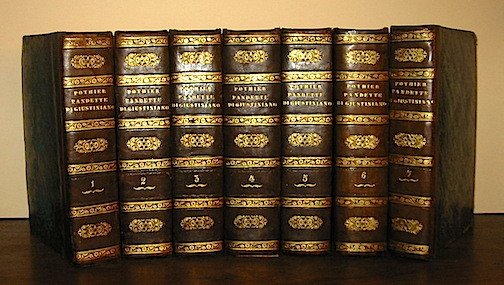 8vo (cm. 23,8), 7 Voll.; CXXXIX-708 pp., 989 pp., 950 pp., 992 pp., 973 pp., 1119 pp., 768 pp., 37 cc.nn. Belle legature coeve in mz. pelle con ricchi fregi, titolo e numerazione in oro al ds. Qualche sporadica ingiallitura, ma ottimo stato di conservazione. Esemplare completo delle ‘Pandette disposte in nuovo ordine da Pothier con le leggi del Codice e le Novelle che confermano, spiegano od abrogano le disposizioni delle Pandette. Versione italiana notabilmente corretta ed in gran parte rifatta col testo delle leggi a piè di pagina’. Assenti i ‘Frammenti delle leggi delle 12. tavole’, i ‘Frammenti dell’editto perpetuo’ e l’ottavo volume di ‘Indice’.