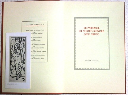 Acqueforti originali di Domenico zangrandi firmate ognuna; 93 pag in perfetto stato; edizione pregiata composta a mano con i caratteri Garaldus, su carta Rusticus, di 250 esemplari numerati a macchina (n.28)e nominati ad personam su carta Fedrigoni; la libreria possiede della stessa serie: STRENNE FIORINI IN EDIZ. LIMITATA - La Salmace ed altri idilli barocchi ; acqueforti di Ada Zanon; € 120 - La poesia di Ugo Foscolo; acqueforti di luigi M. Veronesi; € 120 - Le parabole di nostro signore Gesù Cristo; a.forti Domenico Zangrandi; € 150 - Sant’Ambrogio: Hymni; illustrazioni di Eugenio Tomiolo; € 120 - Ausonio: Carmi; litografie di Giuseppe Ajmone; € 150 - Poesia Nederlandese; acqueforti di Johan Breuker; € 120 - Virgilio: Georgiche; litografie di Renzo Sommaruga; € 120 - Sofocle: Antigone; acqueforti di Ernesto Treccani; € 150 - Il treno; illustrazioni di Renato Di Bosso (futurista); € 120 - La vanità e le rose; acqueforti di Moreno Zoppi; € 150 - Ritsos: Elena; illustrazioni di Davide Antolini; € 100 - Poesia giocosa; litografie di Remo Brindisi; € 150 - D’Annunzio: Liriche; interpretazione grafica Marcello Mascherini; € 120 EDIZIONI FIORINI RILEGATI ediz.limitata - Bergamino da Mantova e Cangrande della Scala; acquaforte di Francesco Arduini; € 100 - Alfieri e Pindemonte alla presa della Pastiglia; acquaforte di Francesco Avesani; € 100 - Orazioni inedite in volgare veronese del secolo XIV; xilografia di Pietro Volpin; € 100