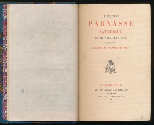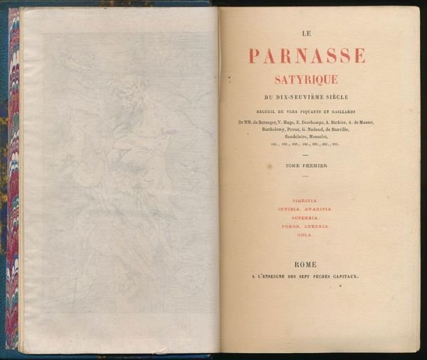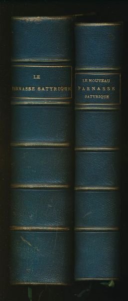 A l'Enseigne des sept pechés capitaux 1864 Rome, A l'enseigne des sept péchés capitaux, sans date (Bruxelles, Poulet-Malassis, 1864). 2 tomes en 1 volume in-12 (170x106mm) reliés demi-chagrin bleu à coins. Dos à nerfs, titre doré, tête dorée, filet doré sur les plats. 1 ff blanc, faux-titre, Frontispice gravé par Félicien Rops, sur Chine en double épreuve, noire et bistre et sous serpentes, titre en rouge et noir, 239 pages, 1ff d'errata pour le tome 1 et faux-titre, titre en rouge et noir, 250 pages, 1 ff d'errata, 1ff blanc. Exemplaire bien complet des 8 fac-similés d'autographes, de la planche de musique et deux feuillets d'errata qui manquent souvent. Les exemplaires complets de tous les hors-textes. sont extrêmement rares : Gay-Lemonnyer III, 648. ÉDITION ORIGINALE, non rognée, de ce recueil de plus 300 pièces d'un grand nombre d'auteurs du XIXe siècle dont Banville, Barbey d'Aurevilly, Baudelaire, R. de Beauvoir, Béranger, Catulle Mendès, Deschamps, Glatigny, Hugo, Janin, Karr, Lamartine, Murger, Musset, Nadaud, Privat d'Anglemont, Roqueplan, Sand, Scribe, etc. La musique est de Reyer, pour une pièce en vers de T. Gautier. Les 8 autographes sont des fac-similés de l'écriture des auteurs suivants : George Sand (Une lettre à sa couturière, elle se plaint qu'elle lui a fait un corset trop étroit) ; Monselet (un impromptu non inséré dans le Parnasse) ; la Chambaudie ; Ch. Baudelaire, Em. Deschamps ; Th. de Bainville ; J. Dufflot et Paul Féval : Bibliographie des ouvrages relatifs à l'amour, aux femmes, au mariage, et des livres facétieux. Tome 5, page 442. On joint : Le Nouveau Parnasse Satyrique du dix-neuvième siècle, suivi d'un Appendice au Parnasse satyrique. Eleutheropolis : Aux devantures des libraires, Ailleurs dans leurs arrière-boutiques 1866 (Bruxelles, Poulet-Malassis). In-12 relié demi-chagrin bleu à coins. Dos à nerfs, titre doré, tête dorée, filet doré sur les plats. 1 ff blanc, faux-titre, frontispice gravé par Félicien Rops en noir et sur Chine, sous serpente, titre en rouge et noir, II, 273 pages, 2ff blancs. EDITION ORIGINALE non rognée sur grand papier vergé de Hollande van Gelder.