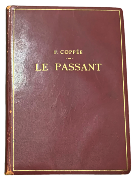 In 8° piccolo (17,3x11,7 cm); (2), 43, (3) pp. e 4 c. di tav. a colori. Brossura editoriale illustrata con titolo, autore ed editore, impresso in rosso e nero al piatto anteriore entro ricca cornice. Legatura coeva in piena pelle rossa con titolo e autore impressi in oro in al piatto anteriore entro cornice in filetto in oro. Piatti interni foderati con carta marmorizzata. Edizione di lusso, tirata in 1500 esemplari, il nostro è l'esemplare numero, 1486. Qualche lieve strofinatura alla legatura, ininfluente e nel complesso in buone-ottime condizioni di conservazione. Edizione per gli amatori dei libri di questa commedia del celebre poeta, drammaturgo francese François Édouard Joachim Coppée (Parigi, 26 gennaio 1842 Parigi, 23 maggio 1908).