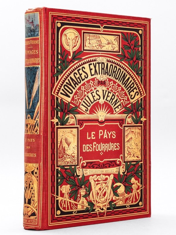 Illustré par Férat et de Beaurepaire, 1 vol. in-4 cartonnage éditeur pleine percaline polychrome à un éléphant, titre dans le cartouche, dos au phare, second plat Hachette (H & Cie) Bottin type "r", toutes tranches dorées, Les Voyages Extraordinaires, Collection Hetzel, Paris, s.d. [ circa 1914-1917 ], 412 pp. avec 6 planches polychromes Bel exemplaire de cartonnage "hybride" polychrome Hetzel au dos au phare, au second plat Hachette, bien complet des 6 hors-texte en couleurs.