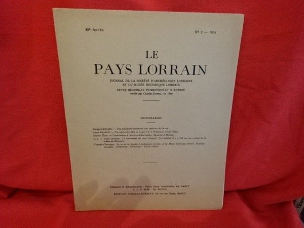 Nancy, le Pays Lorrain, 1969; in-4, 32 pp. (compris faux-titre & titre, année 1969) pp., couverture beige et cahiers agrafés. Sommaire : Hubert COLLIN : L'ancien château de Mandres-aux-Quatre-Tours, p. 5./ Maurice NOËL : Le palais épiscopal de Toul de la Révolution à nos jours, p. 13./ Chanoine Jean DENAIX : Un site lorrain à sauvegarder : Hattonchâtel, p. 25.