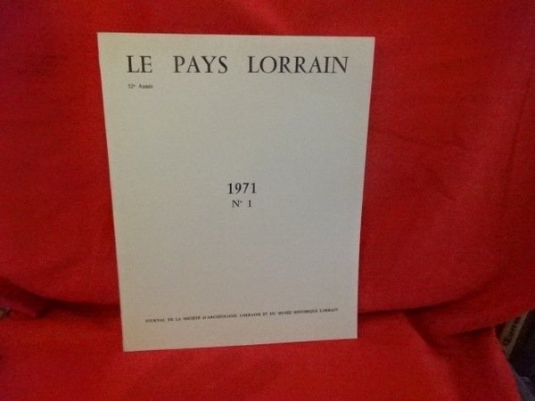 Nancy, le Pays Lorrain, 1982; 221 x 275 mm, 42 pp. + 2 pp. (table, année 1982) pp., broché, couverture blanc mat. Sommaire : Michèle BEAULIEU : Deux terres-cuites de L.-S. Adam au Musée lorrain, p. 189./ Laurent OLIVIER : Bilan de la première campagne de sauvetage programmé de la nécropole de La Naguée, à Clayeures (Meurthe-&-Moselle), p. 197./ Marianne BARRUCAND : Le crucifix émaillé du trésor de la cathédrale de Nancy, p. 205./ René CUÉNOT : Les Heures de la Vierge de 1503 : un exemplaire unique qui s'est trouvé un frère, p. 207./ Pierre PÉGEOT : Une découverte épigraphique à l'ancienne abbaye de Clairlieu, en 1981, p. 211./ Thierry LENTZ : Un Messin méconnu : Jean-Victor Colchen, premier préfet de la Moselle, p. 215./ *** : Chronique, p. 218.