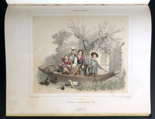 Goupil, Vibert & C.ie Editeurs - London, E. Gambart, Junin & C. senza data ma 1840 circa. Album in folio di cm 34 x 43 (alla legatura), composto di frontespizio illustrato in tratteggio marrone (un pittore seduto circondato dagli strumenti del mestiere) e contenente 12 splendide litografie in coeva coloritura manuale di cm 31 x 42 (ciascuna stampa), legatura orig. in tutta tela blu con titoli oro, contropiatti e fogli di guardi in carta gialla. Frontespizio uniformemente ingiallito, peraltro solo lievissime e sporadiche presenze marginali alle tavole che si presentano ben pulite e tutte in ottimo stato di conservazione.