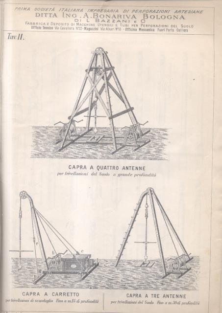 3ª edizione. A cura della "Prima Società italiana impresaria di perforazioni artesiane". Cm.31,4x21,5. Pg.88. Da rilegare. Bruniture alla coperta. Con sette tavole tecniche, una all'antiporta e sei in fine. Codice libreria 136170.